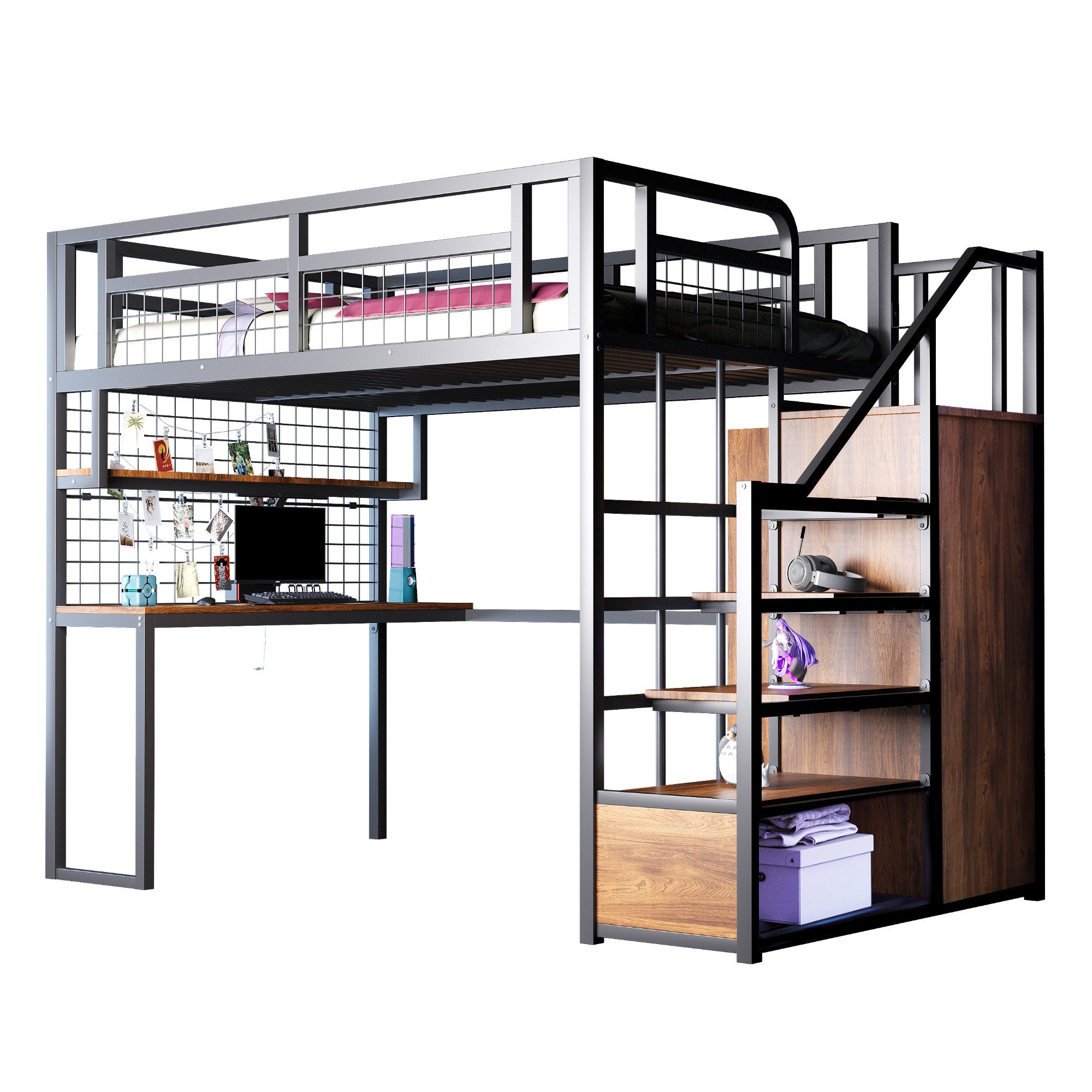 Die seitliche Aufbewahrungsleiter dieses Hochbettes erleichtert Ihnen nicht nur das sichere und bequeme Auf- und Absteigen, sondern verfügt auch über einen eingebauten Kleiderschrank, der sich ideal für die Aufbewahrung von Kleidung, Taschen oder anderen notwendigen Dingen eignet. Unter dem Bett sind geschickt ein Regal und ein Tisch integriert, die Ihnen einen praktischen Arbeits- oder Lernbereich bieten. Die Metallgitterplatte unter dem Bett kann als Fotowand oder Aufbewahrungsregal verwendet werden, sodass Sie Ihren Raum mit Fotos, Notizen oder Dekorationen individuell gestalten können.