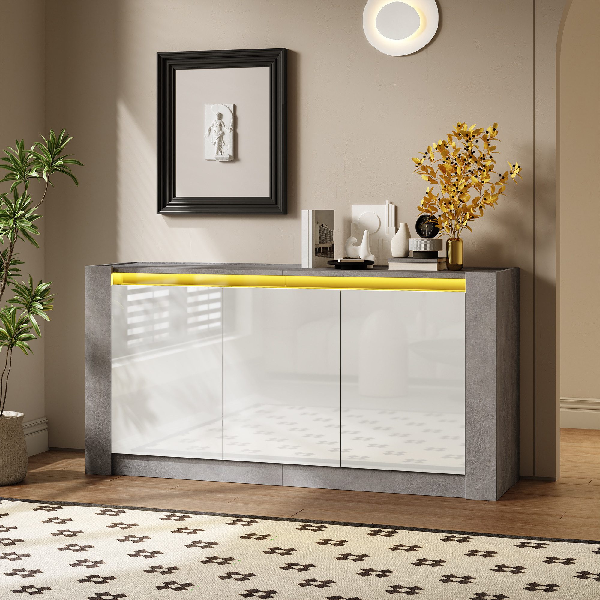 Dieses Sideboard überzeugt mit einer Hochglanz-Oberfläche, die in modernen Wohnstilen perfekt zur Geltung kommt. Das grifflose Design mit integrierter LED-Beleuchtung schafft eine stilvolle und gemütliche Atmosphäre.