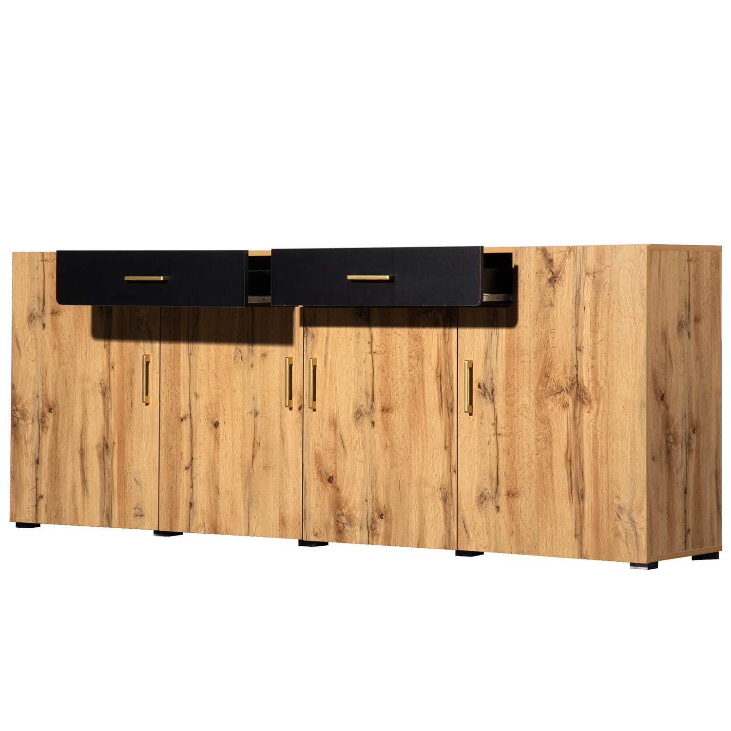 Das Sideboard bietet 2 große Schubladen und 4 Türen mit verstellbaren Regalen, die ausreichend Stauraum für Ihre Haushaltsgegenstände bieten. Die Schubladen eignen sich perfekt für kleinere Gegenstände wie Besteck, Fernbedienungen oder Bücher, während die Regale hinter den Türen auch größere Artikel wie Gläser, Bücher oder TV-Zubehör aufnehmen können. Jedes Regal hinter den Türen ist verstellbar, sodass Sie die Höhe anpassen können, um den Stauraum zu optimieren. Diese Flexibilität sorgt für eine optimale Raumnutzung und eine einfache Organisation.