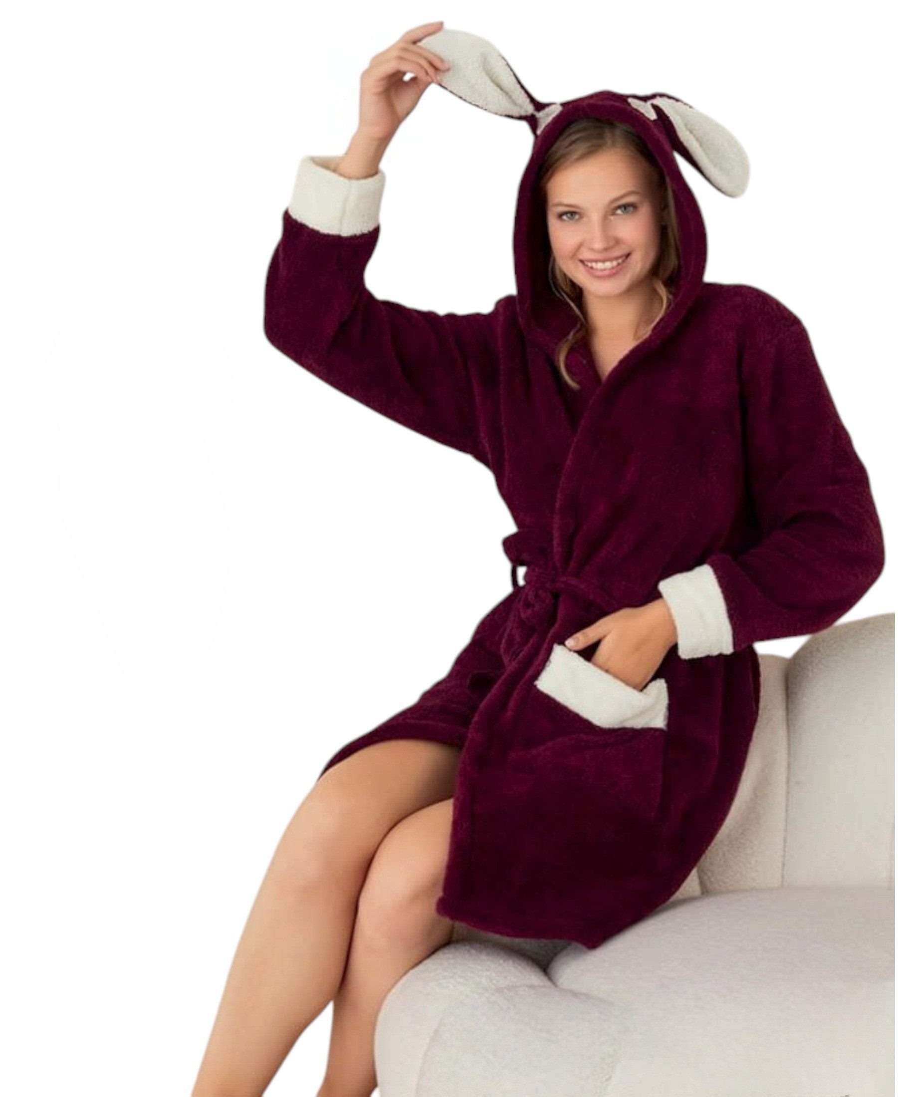 Entdecke den perfekten Mix aus Komfort und Stil mit unserem flauschigen Damen-Bademantel aus Wellsoft-Fleece. Erhältlich in vier charmanten Designs, sorgt er für maximale Gemütlichkeit zu Hause, nach dem Duschen oder beim Entspannen auf dem Sofa. Die hochwertige Wellsoft-Fleece-Qualität (100 % Polyester) ist besonders weich, wärmend und atmungsaktiv. Dank der Kapuze, des Bindegürtels und der praktischen Taschen bietet der Bademantel optimalen Komfort. Erhältliche Designs & Farben: Hellgrau mit weißen Details – Schlicht & elegant, perfekt für minimalistische Looks. Olivgrün mit Bären-Stickerei ("Cute Bear Kissy") – Verspielt & süß, mit liebevoller Applikation. Bordeaux mit Hasenohren an der Kapuze – Für den verspielten Look, ideal zum Kuscheln. Bordeaux mit Hasen-Stickerei ("Bunny Bear") – Niedliches Design mit Stickdetails auf der Brust. Größen: S/M L/XL