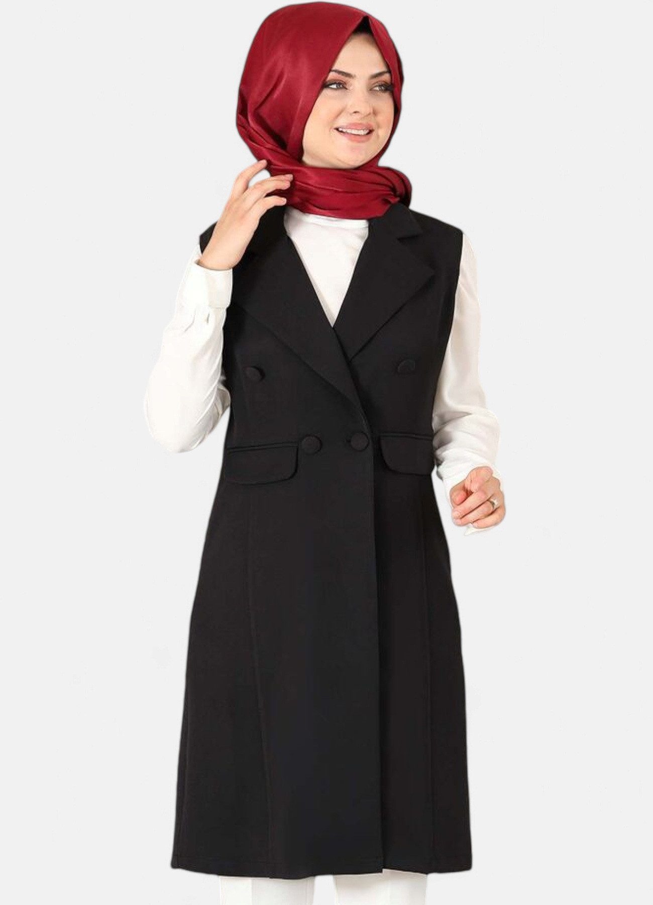 Entdecken Sie die perfekte Kombination aus Stil und Komfort mit unserer Damen Longtunika-Weste. Diese elegante Weste ist aus hochwertigem Kreppmaterial gefertigt, das nicht nur langlebig, sondern auch besonders angenehm zu tragen ist. Dank ihrer knitterfreien und atmungsaktiven Eigenschaften ist diese Weste die ideale Wahl für jede Jahreszeit und jeden Anlass – ob lässig im Alltag oder schick für besondere Anlässe. Das raffinierte Knopfdetail und der klassische Kragen verleihen der Weste einen eleganten Look, der sich mühelos mit verschiedenen Outfits kombinieren lässt. Die seitlichen Taschen sind nicht nur ein optisches Highlight, sondern unterstreichen den stilvollen und durchdachten Designansatz, auch wenn sie nicht funktional sind. Die Weste ist in den eleganten Farben Rosa, Ecru-Weiß, Schwarz und Violett erhältlich und passt sich jeder Garderobe perfekt an. Ob als modischer Begleiter für den Alltag oder als stilvolle Ergänzung zu Ihrem abendlichen Outfit, diese Longtunika-Weste lässt sich vielseitig kombinieren und hebt Ihren Look auf ein neues Level. Die lange, gerade Passform sorgt für eine schmeichelhafte Silhouette, während das hochwertige Kreppmaterial für einen fließenden und bequemen Sitz sorgt. Für optimalen Tragekomfort empfehlen wir, eine Размер größer zu wählen, da das Modell etwas enger ausfällt. Die Longtunika-Weste ist perfekt für Modest Fashion Liebhaberinnen, die auf der Suche nach einem stilvollen, aber zugleich praktischen Kleidungsstück sind. Dank der knitterfreien Eigenschaften bleibt sie den ganzen Tag über frisch und faltenfrei. Kombinieren Sie diese Weste mit einer schlichten Bluse oder einem eleganten Oberteil und kreieren Sie einen stilvollen und modernen Look.