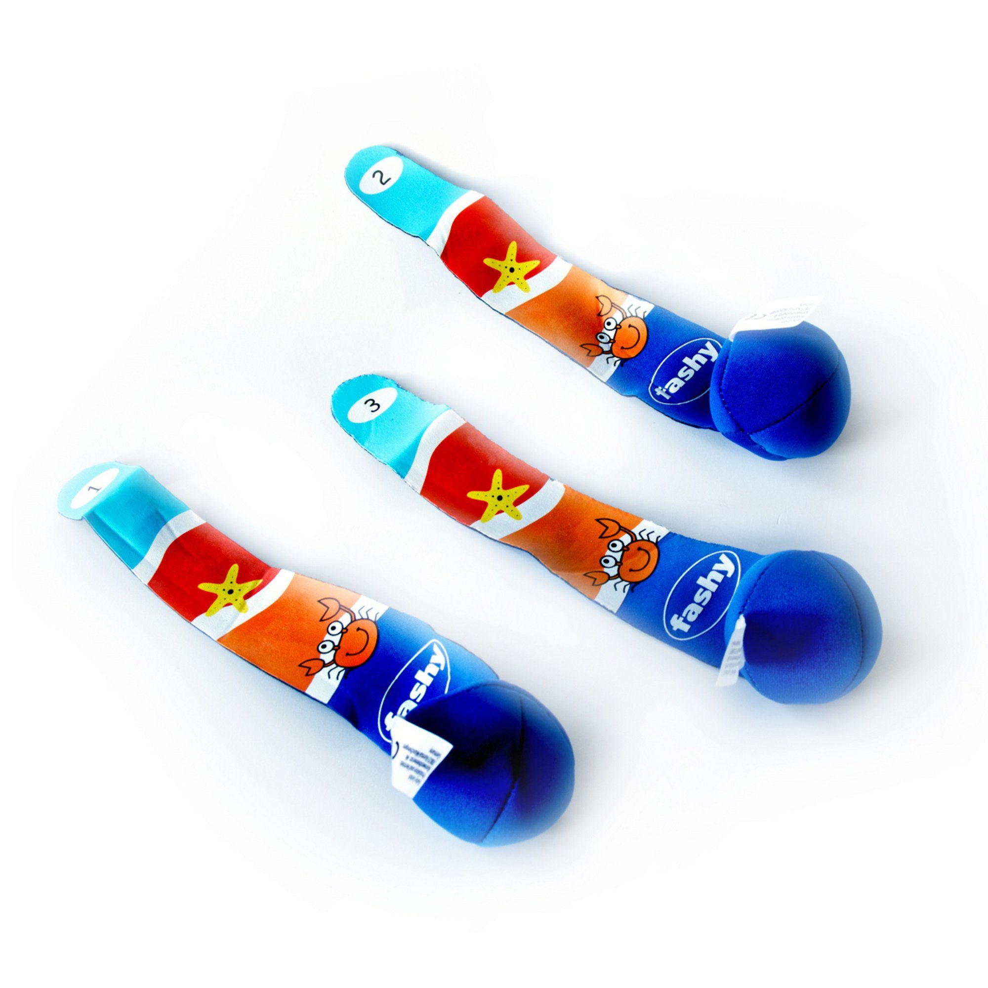 Die Neopren-Tauchfahnen von Fashy bleiben gut ersichtlich im Wasser stehen und eignen sich somit hervorragend für ein gezieltes Schwimmtraining. Sie sind mit einem lustigen Seestern und einer tanzenden Krabbe versehen.