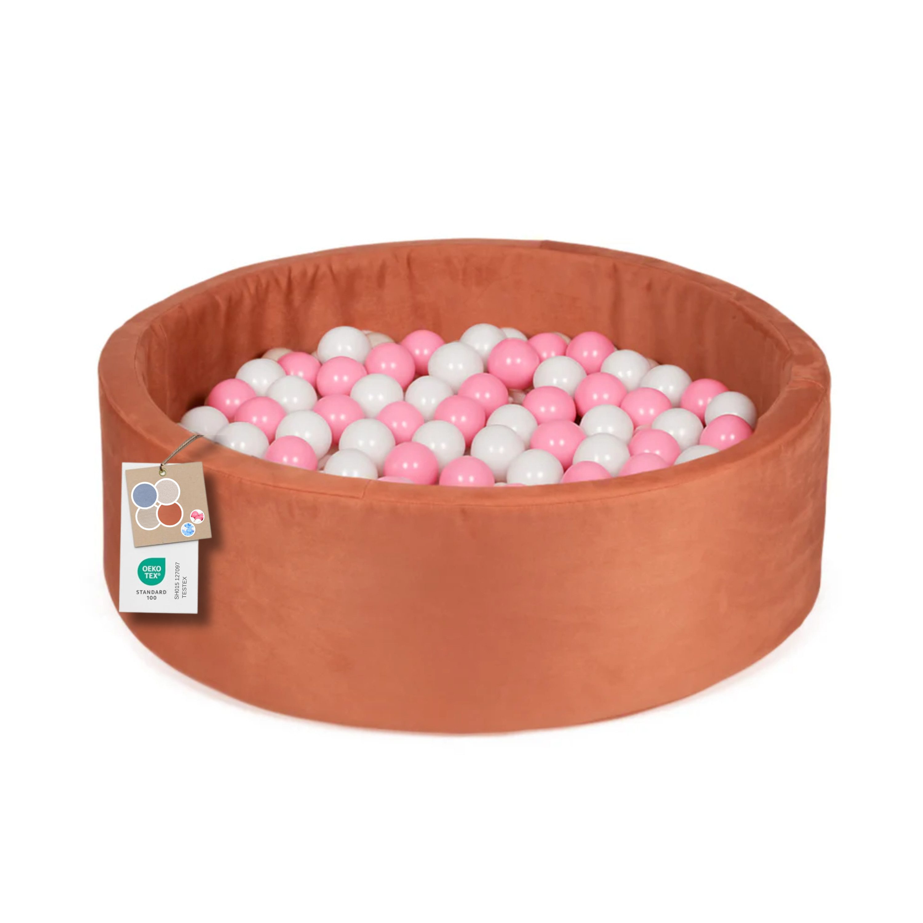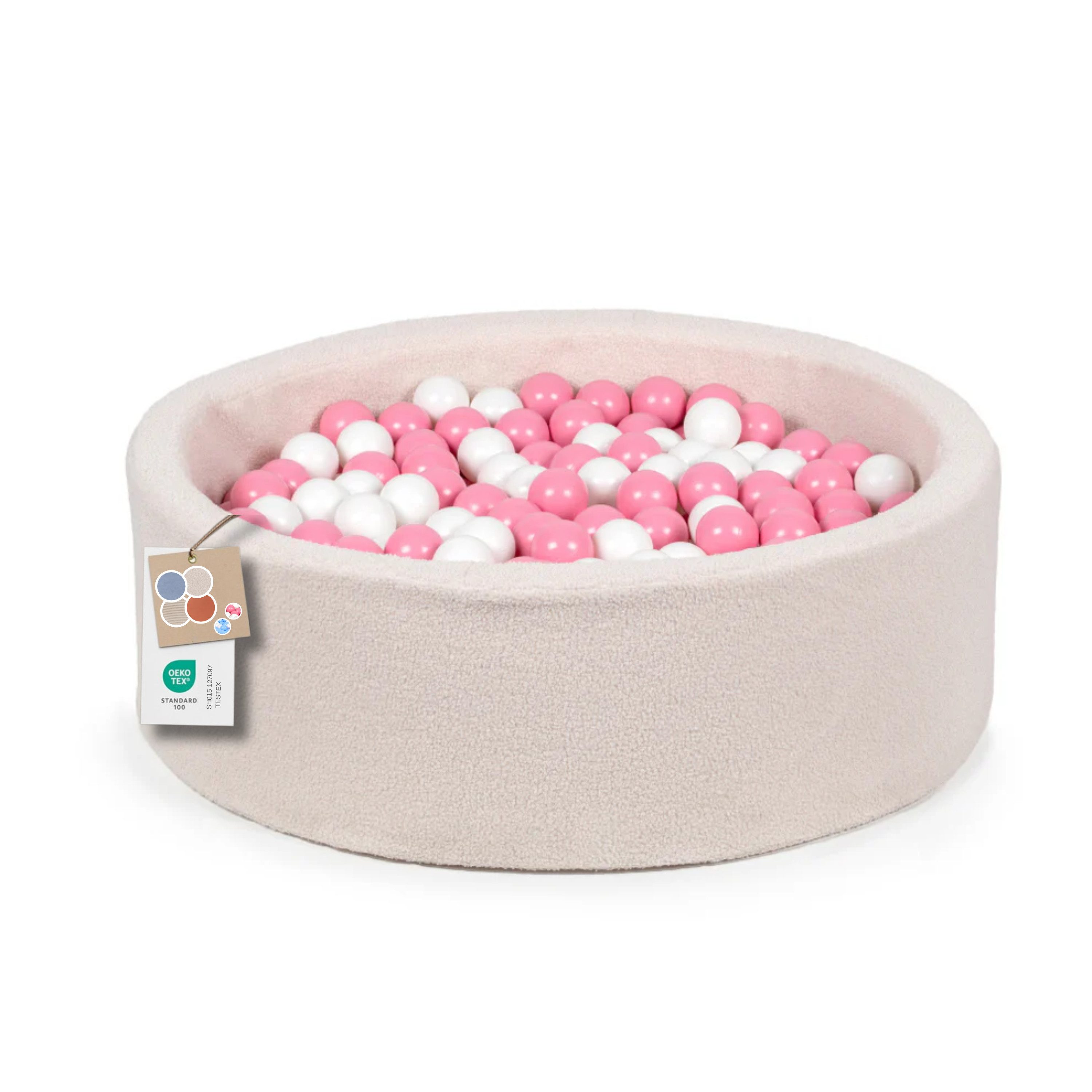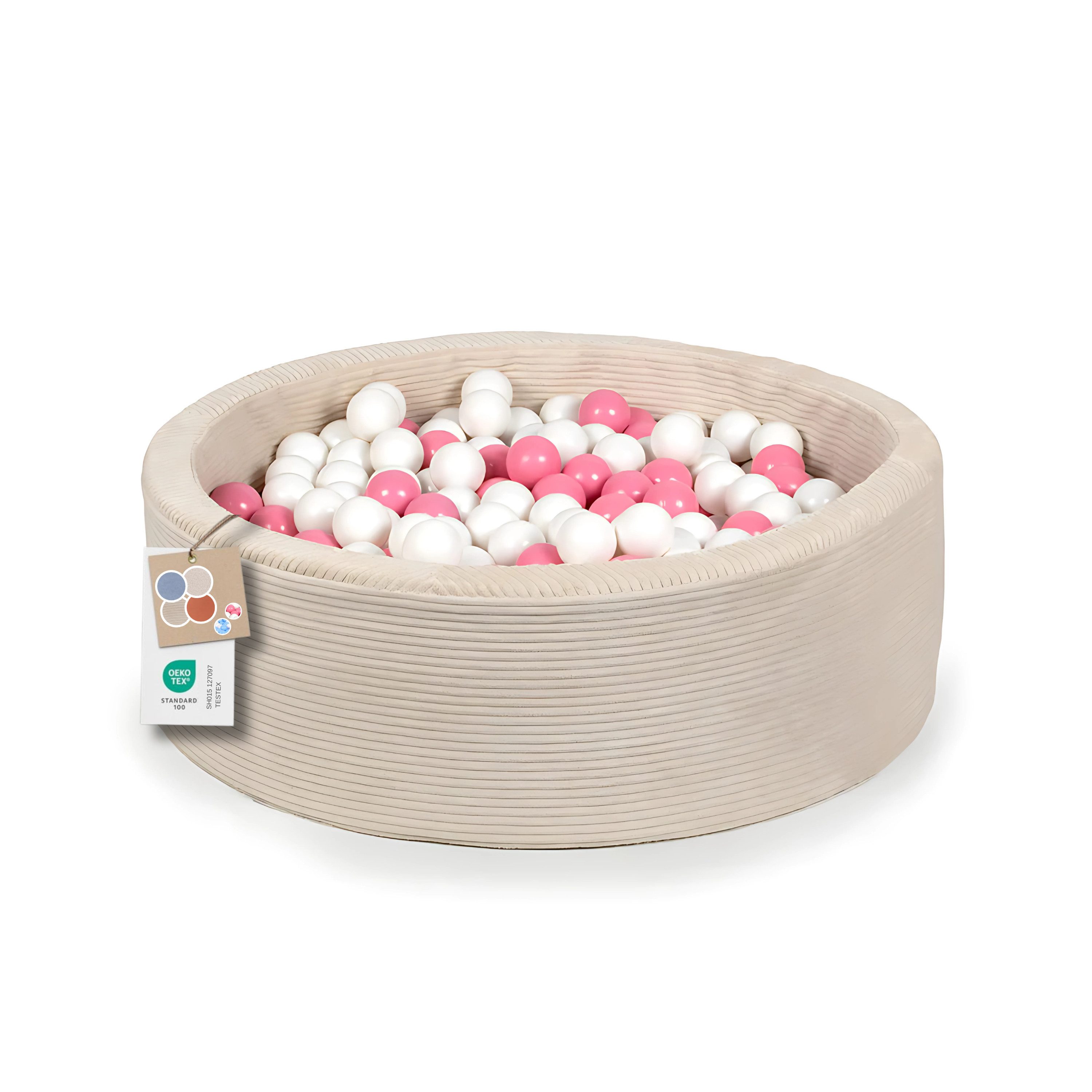 Basen von Favre – Stilvolle Ballpools für Kinder Sicherer Spielspaß mit Stil Die Ballpools von Favre bieten den perfekten Ort für Kinder, um sich auszutoben, kreativ zu spielen und gleichzeitig ihre motorischen und sensorischen Fähigkeiten zu fördern. Weiche Wände, eine stabile Konstruktion und 200 farbenfrohe Bälle schaffen eine sichere und einladende Spielumgebung, in der sich Kinder geborgen fühlen. Durchdachte Proportionen Außendurchmesser: 100 cm Innendurchmesser: 85 cm Höhe: 31 cm Wandstärke: 6 cm Diese Maße sorgen für ausreichend Platz zum Spielen – ideal für Kleinkinder und auch für etwas ältere Kinder. Komfort und Sicherheit in einem Hochwertiger Schaumstoff bildet die Basis der elastischen Wände, die Stöße sanft abfedern. Die robuste Formgebung verhindert, dass der Pool einknickt oder seine Form verliert. Vielfalt in Stoff und Farbe Zur Auswahl stehen drei edle Stoffvarianten – Bouclé, Cord und Samt. Jeder Stoff überzeugt mit einer angenehmen Haptik und verleiht dem Ballpool einen modernen Look, der sich harmonisch in jedes Kinderzimmer oder Spielzimmer einfügt. Zwei Ballsets zur Auswahl Weiß/Blau Rosa/Weiß Pflegeleicht im Alltag Der abnehmbare Bezug kann einfach gewaschen werden – so bleibt der Ballpool hygienisch sauber und jederzeit einsatzbereit. Hauptmerkmale: Sichere, stabile Konstruktion aus weichem Schaumstoff Drei Stoffvarianten: Bouclé, Cord, Samt Zwei Ballsets: Weiß/Blau oder Rosa/Weiß (200 Bälle) Durchdachte Maße: 100 cm (außen) x 85 cm (innen) x 31 cm (Höhe) Wandstärke 6 cm für Stabilität und Komfort Abnehmbarer, waschbarer Bezug für leichte Reinigung Unterstützt die motorische und sensorische Entwicklung