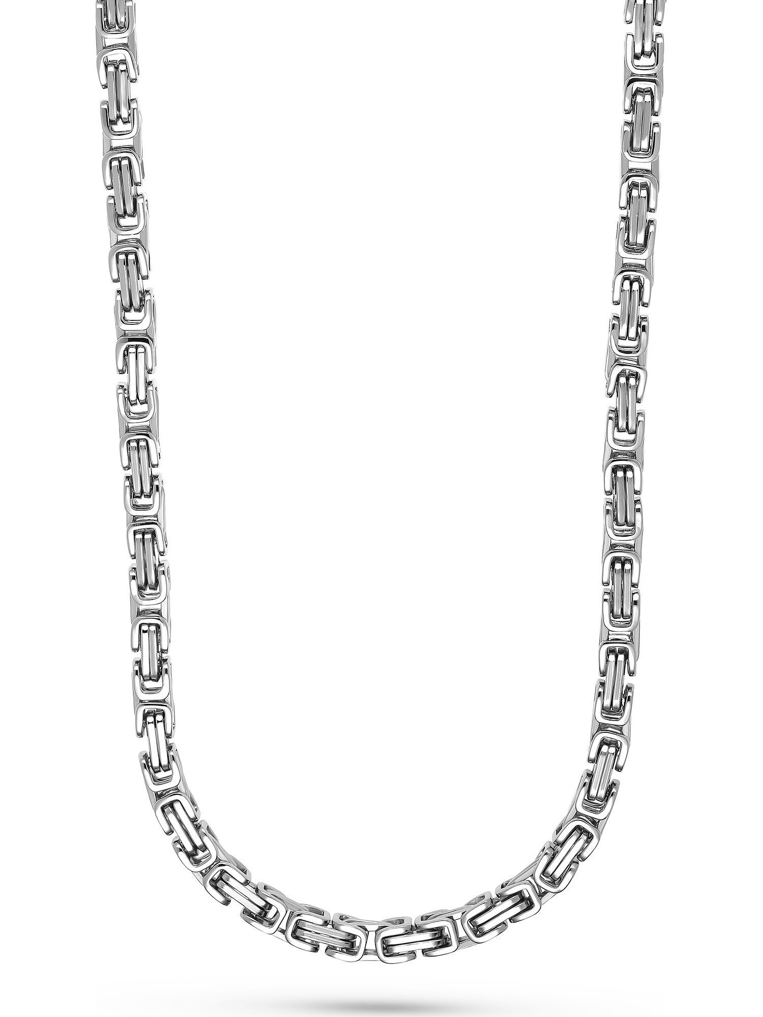 Die Halskette aus massivem Edelstahl präsentiert sich charakterstark und männlich. Die breiten, doppelten Glieder greifen wie Werkzeuge ineinander. Durch die Politur der Oberfläche bringt FAVS die Königskette zum Glänzen. Zum schlichten Basic-Shirt oder unter einem Uni-Hemd blitzt die Kette stilvoll hervor. So sieht schöner Männerschmuck aus: markant und lässig, ohne Kompromisse.