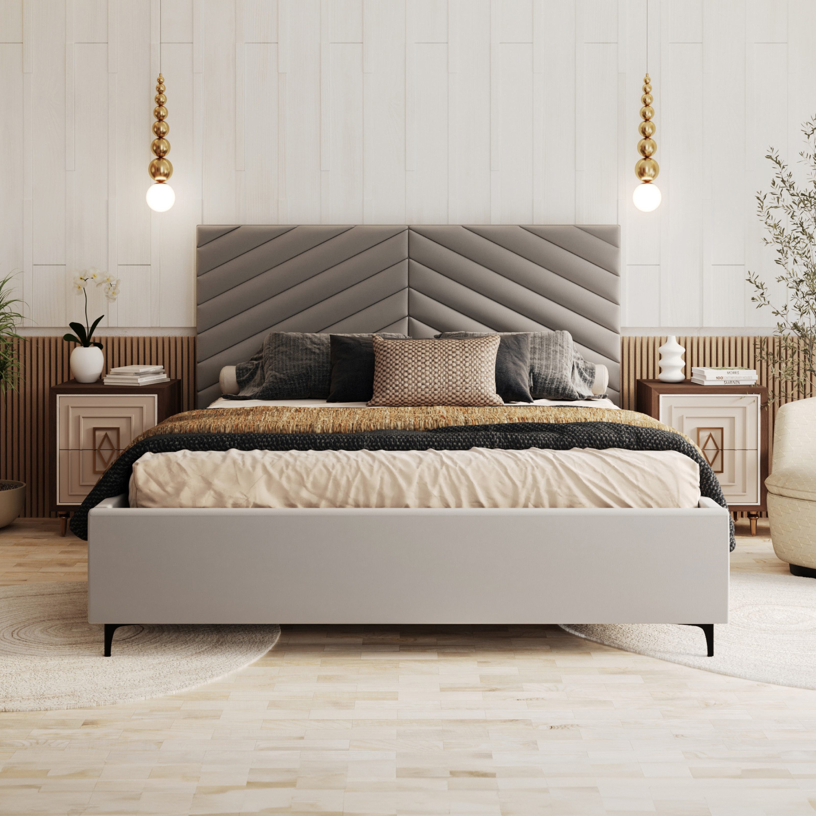 Das gepolsterte Kopfteil verleiht dem Bett einen stilvollen Charakter und unterstreicht seine moderne Ästhetik. Es schließt bündig mit der Wand ab und bietet angenehme Unterstützung beim Sitzen, Lesen oder Frühstücken im Bett. Die Form passt sich mühelos verschiedenen Einrichtungsstilen an – von modern über skandinavisch bis hin zu industriell oder glamourös.