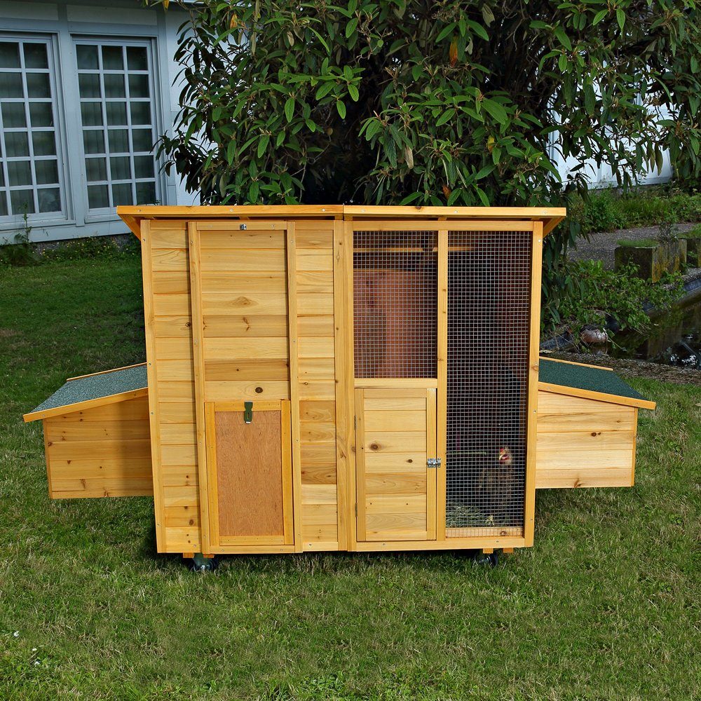 Dieser wunderschöne und vor allem durchdachte Hühnerstall bietet Ihren Hühnern eine artgerechte Behausung mit entsprechenden Rückzugsmöglichkeiten und der nötigen Bewegungsfreiheit. Die seitlich angebrachte Nestboxe mit insgesamt 2 Nistplätzen und der nach oben zu öffnendem Deckel bieten den Hühnern viel Platz und ermöglichen es Ihnen, die frischen Eier ohne großen Aufwand zu entnehmen. An der Vorderseite des Hühnerhauses befindet sich ein durch eine Falltür verschließbarer Eingang für die Hühner. Ebenfalls verfügt die Vorderseite über eine verriegelbare Tür. Der gesamte Stall steht auf 4 ca. 15 cm hohen Rädern, welche auch in unwegsamem Gelände gute Dienste erweisen.