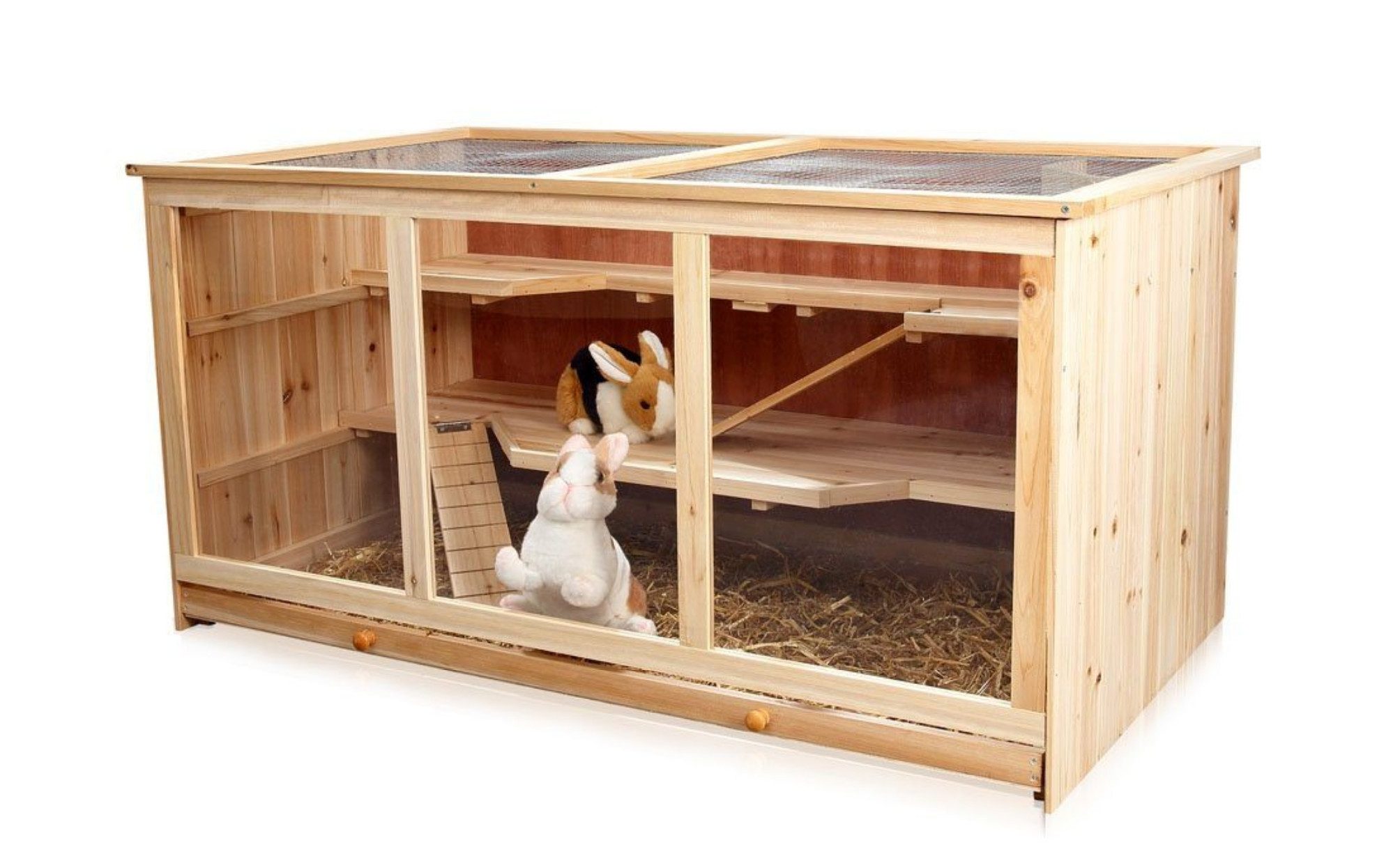 Dieser Kleintierstall ist das ideale Zuhause für Kaninchen, Meerschweinchen, Hamster, Mäuse, Ratten und andere Nagetiere. Die Vorderfront besteht aus hochwertigem Plexiglas im Holzrahmen, während der Deckel zusätzlich mit Drahtgeflecht versehen ist. Dank der Plexiglasfront können Sie Ihre Tiere jederzeit beobachten und sich an ihnen erfreuen. Eine Besonderheit des Käfigs sind die drei Stockwerke - hier haben die Tiere viel Platz zum Spielen, Toben und Kuscheln. Die Ebenen sind jeweils durch Holzstege miteinander verbunden. Für noch mehr Geborgenheit sorgt das kleine, integrierte Häuschen. Gleichzeitig begeistert der Nagerkäfig durch eine leichte Reinigung.