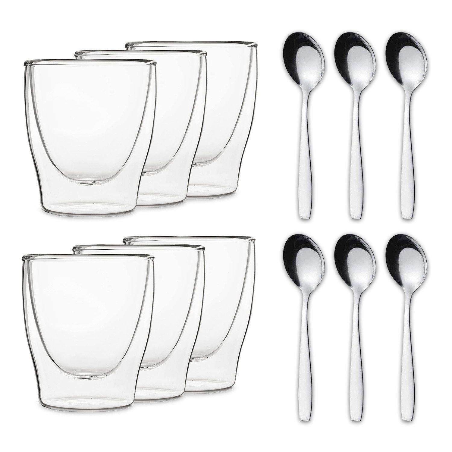 Das edle DUOS Trinkglas von Feelino by Klarstein ist handgefertigt und bereichert dein Wohnambiente mit seiner eleganten Formgebung. Die doppelwandige Glasschicht hält dabei kalte Getränke länger kalt und warme länger warm. Die Применитьung aus Borosilikatglas macht das ansehnliche Gefäß für Espresso, Tee, Shots, Aperitifs oder Nachspeisen besonders resistent und hitzebeständig: Es ist kratzfest, sehr leicht und natürlich spülmaschinengeeignet. Das Doppelwand-System sorgt zusätzlich für einen verblüffenden optischen Effekt, durch den die Flüssigkeiten zu schweben scheinen. Ein mitgelieferter Edelstahl-Löffel pro Glas macht das Gläserset perfekt!