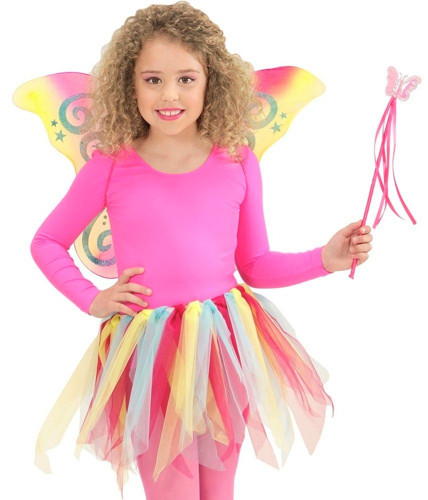 Zauberhaft geht es mit dieser Verkleidung für Mädchen zu. Das Feenkostüm in kräftigen Regenbogen Farben ist ein dreiteiliges Kostümset bestehend aus Schmetterlingsflügeln, einem Feenstab und einem bunten Tüllrock.