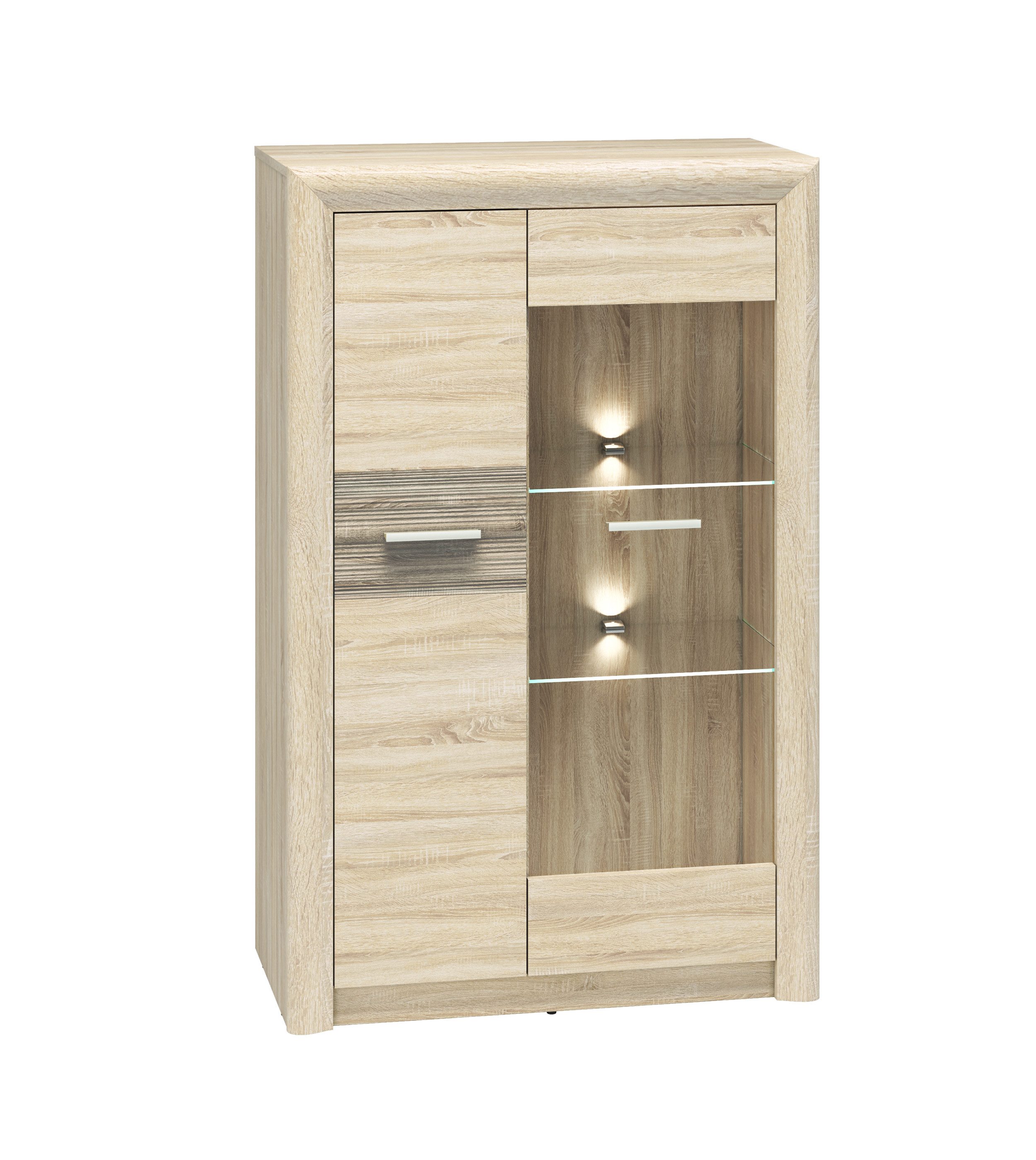 Die geriffelten MDF-Absetzungen und die abgerundeten MDF-Rahmen verleihen dieser Möbelserie einen exklusiven Charakter. Die champagnerfarbenen Griffe bilden mit dem Dekor Sonoma Eiche ein wunderschönes und attraktives Ensemble für Ihr Wohnraum.