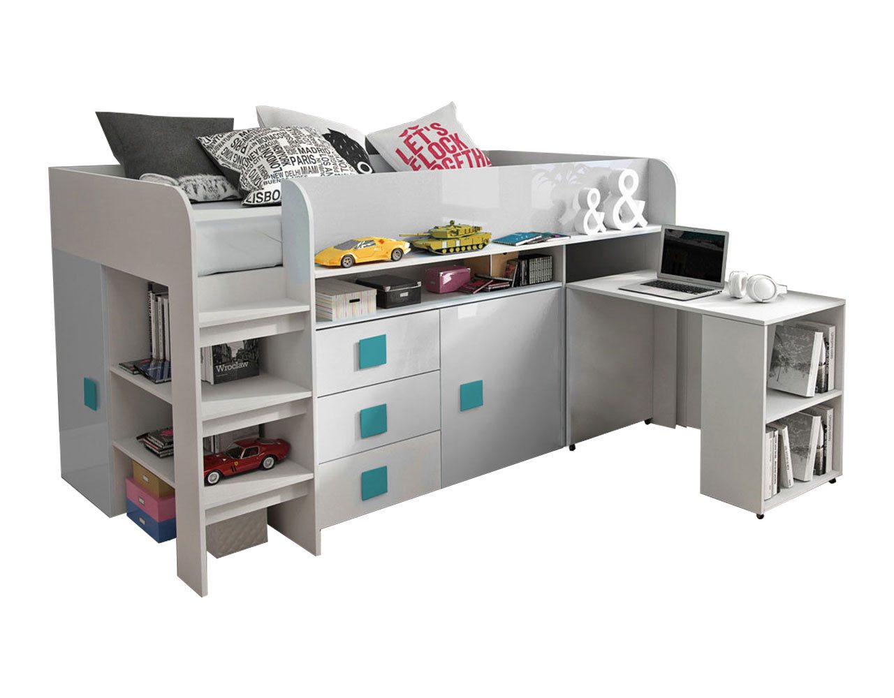 Funktionelles und praktisches Hochbett, das Ihren Kindern ausreichend Stauraum für Nützliches bietet.