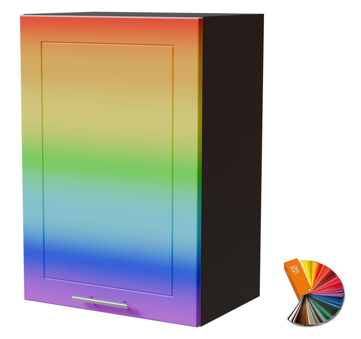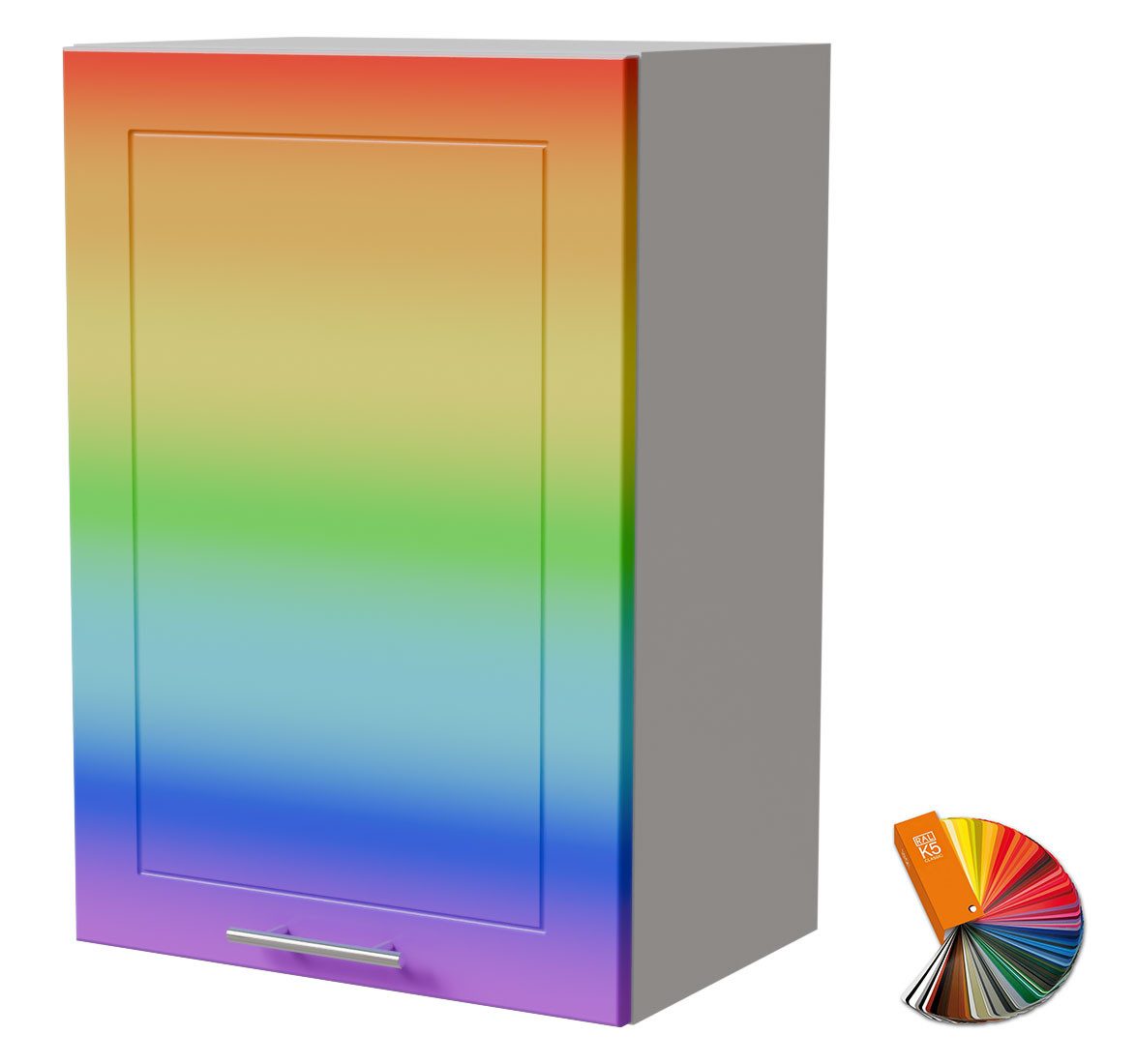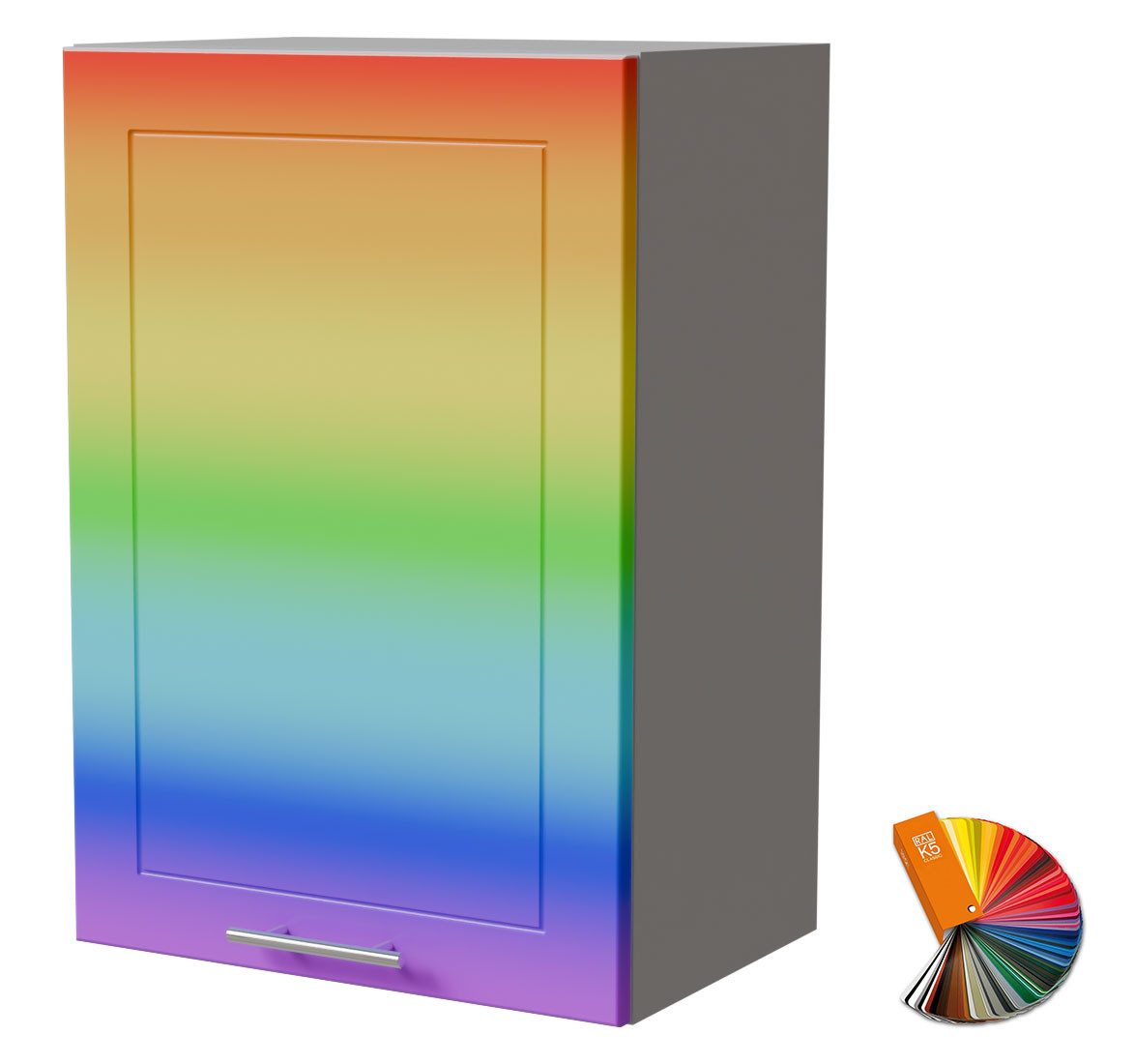 Bitte beachten Sie: Die regenbogenfarbene Schrankfront ist nicht bestellbar. Diese dient lediglich zur Darstellung der Farbenvielfalt, in der dieser Schrank, basierend auf dem K5-Farbfächer, bestellbar ist.