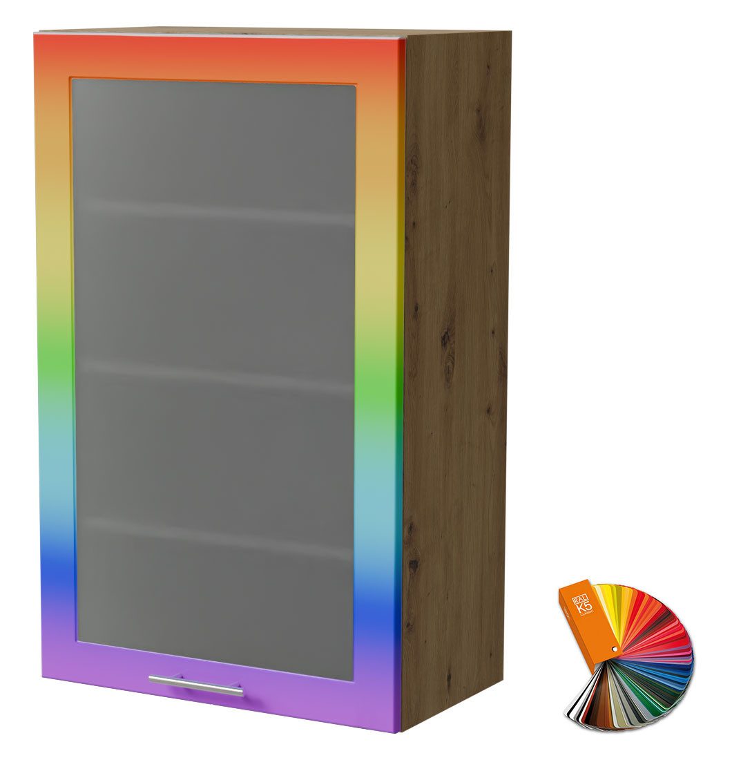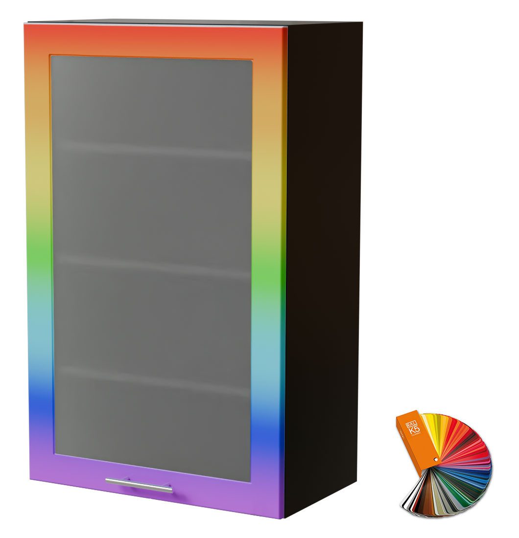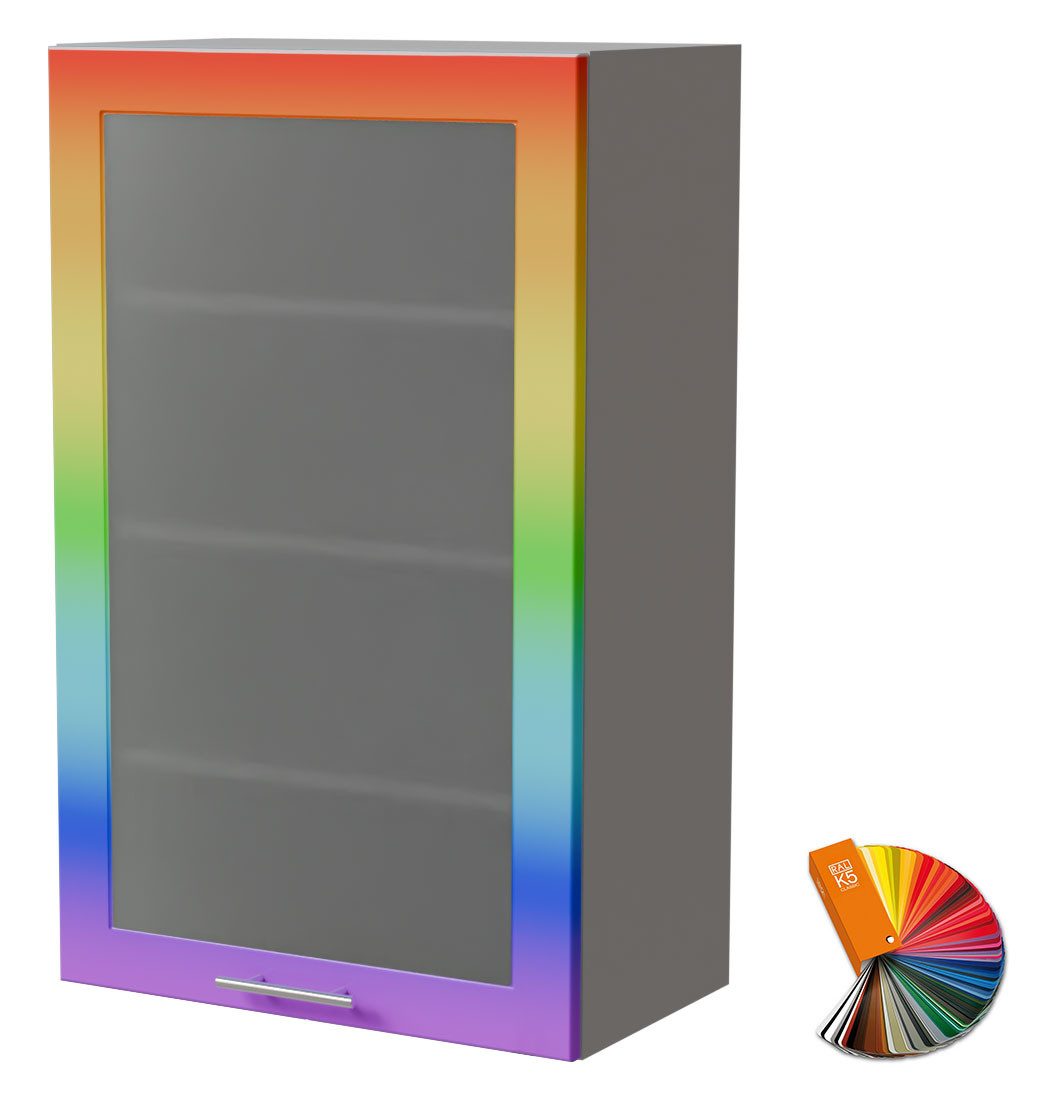 Bitte beachten Sie: Die regenbogenfarbene Schrankfront ist nicht bestellbar. Diese dient lediglich zur Darstellung der Farbenvielfalt, in der dieser Schrank, basierend auf dem K5-Farbfächer, bestellbar ist.