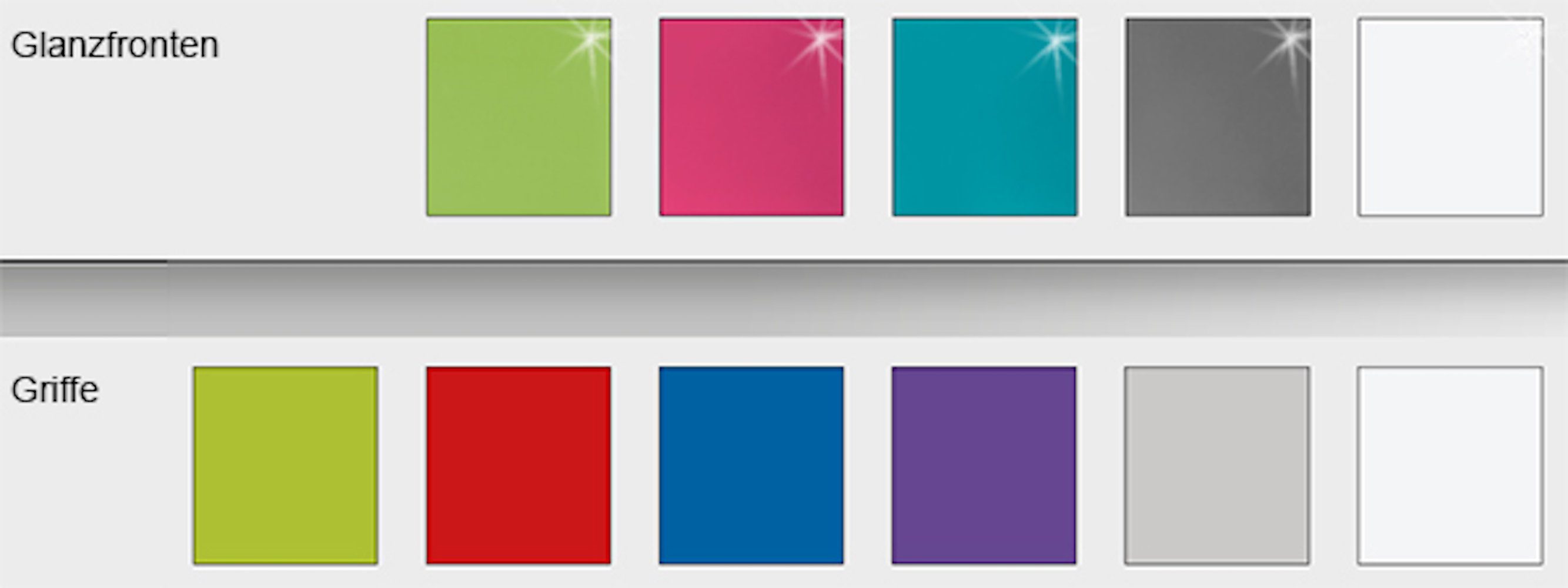 Der Korpus ist immer weiß matt - wählen Sie eine Glanzfront und ganz individuell eine Grifffarbe dazu.