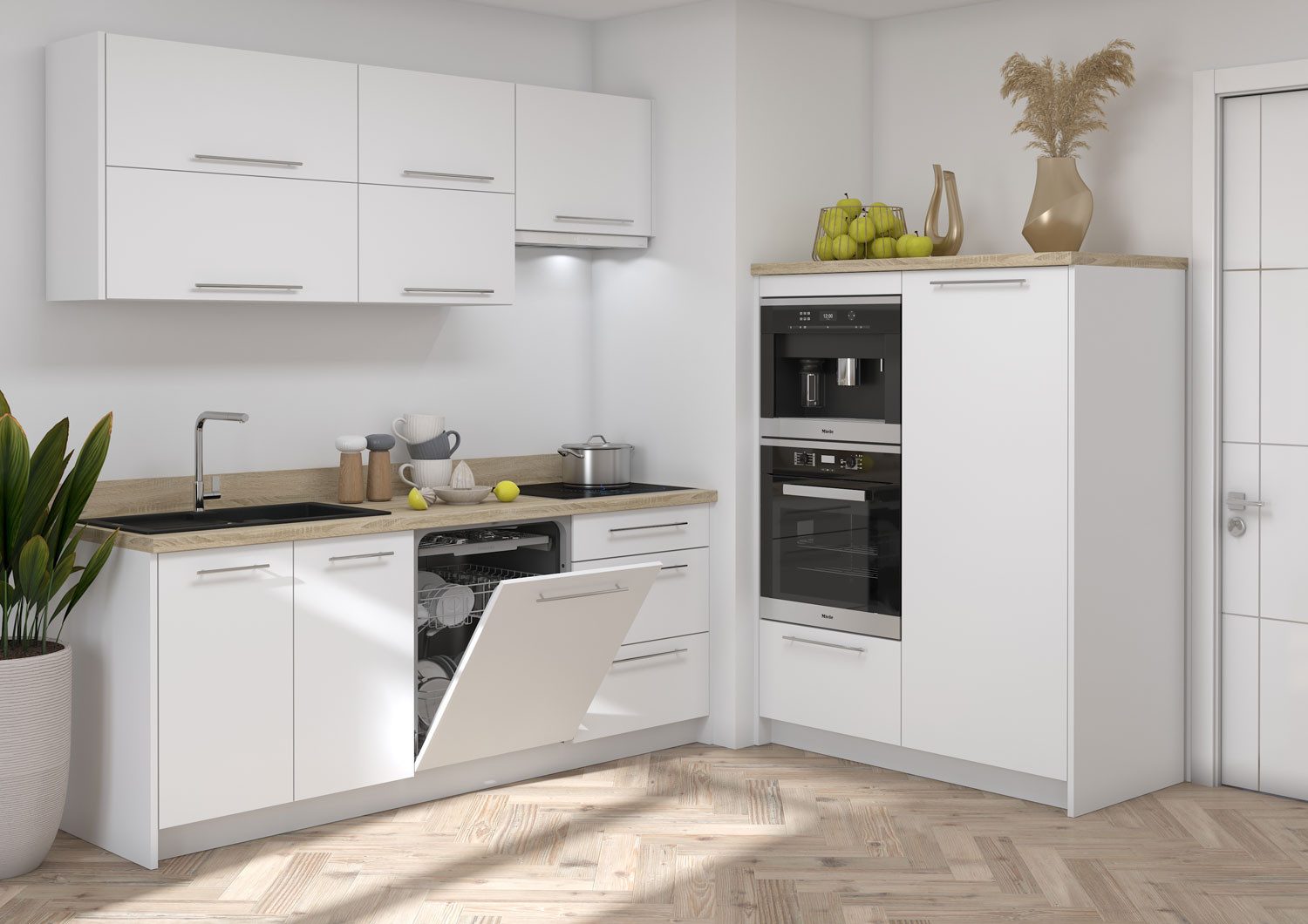 Set beinhaltet | 4x Klapphänge-, 1 Wrasen-, 1 Spülenunter-, 1 Schubladenunter-, 1 Vorrats-, 1 Backofenumbauschrank, 1 Geschirrspülfront, 6x Rahmen, 2x Arbeitsplatte |