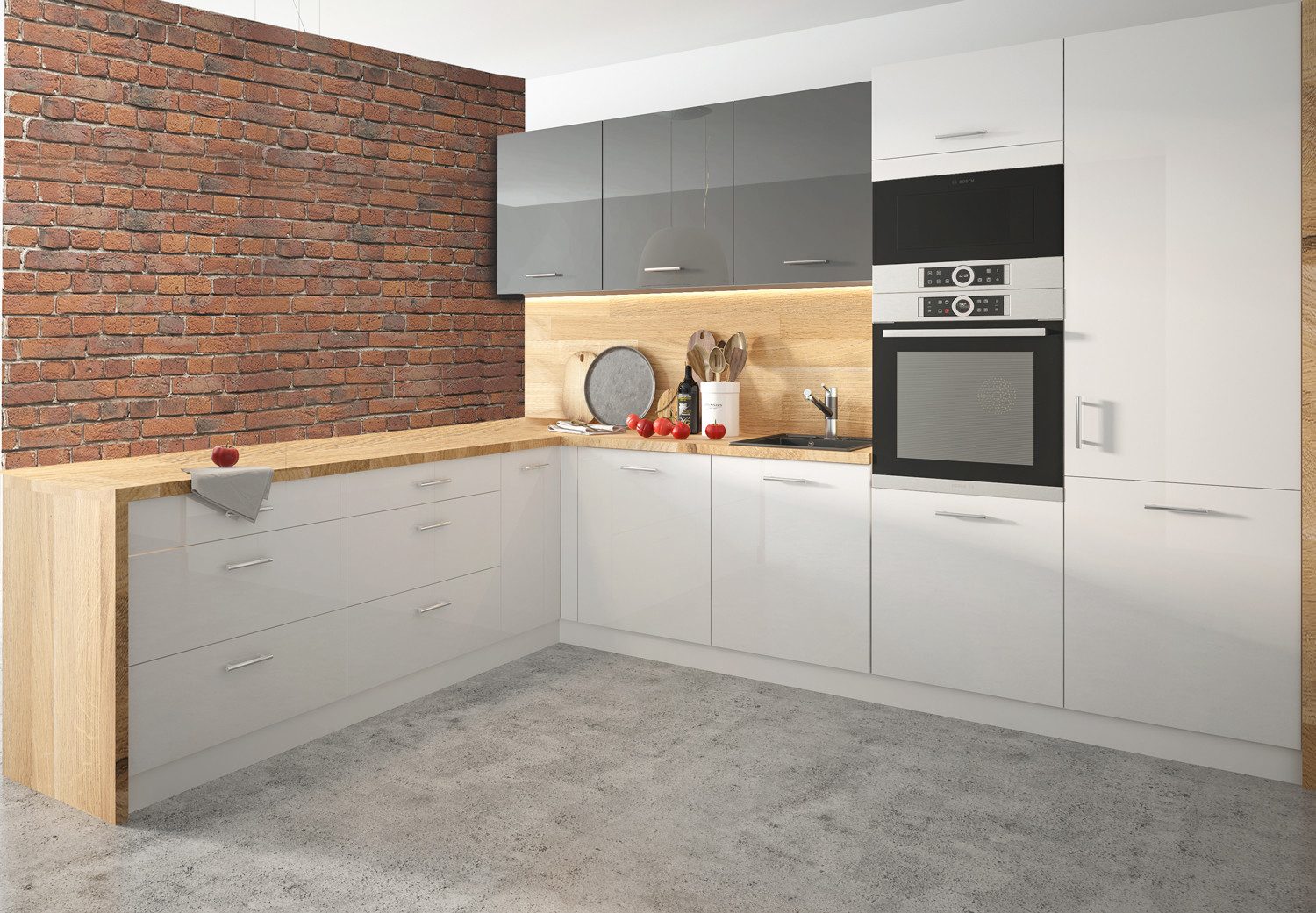 Set beinhaltet | 3x Hängeschränke, 3x Unterschränke, 1x Eck-Unterschrank, 1x Spülenunterschrank, 1x Backofen-Hochschrank, 1x Hochschrank für Kühl-Gefrierkombination |