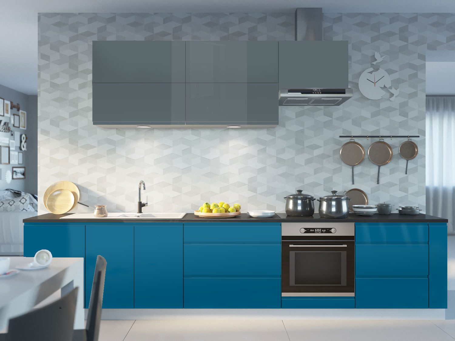 - Fronten: Hängeschränke RAL 7031-GL (blaugrau) / Unterschränke RAL 5019-GL (capriblau) (K7) Hochglanz lackiert