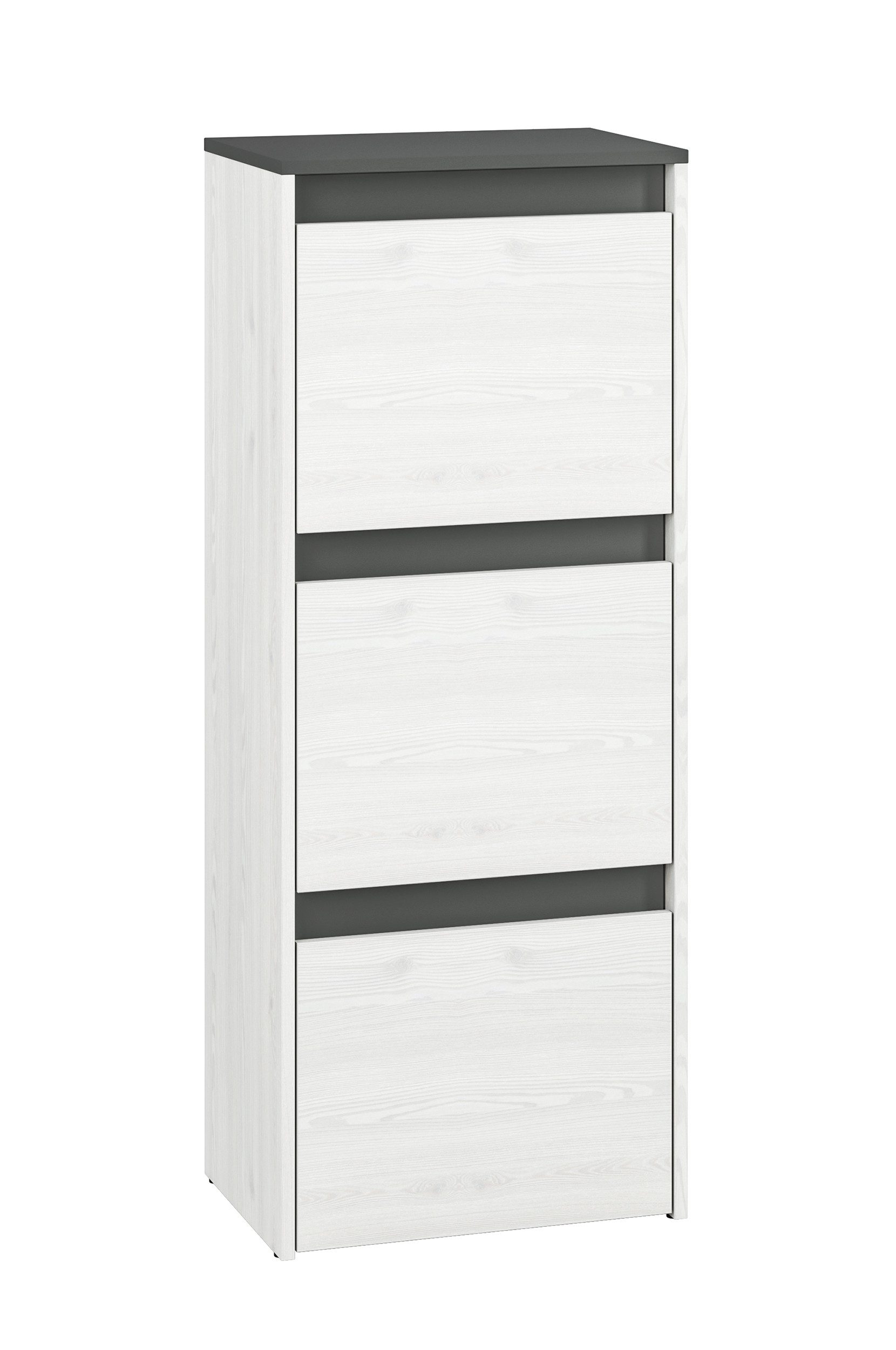Das Dekor Pinie weiß mit den anthrazit Absetzungen verleiht dieser Möbelserie einen exklusiven Charakter.