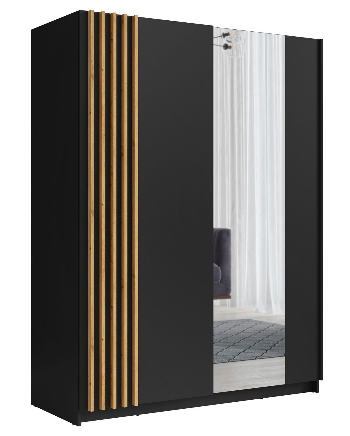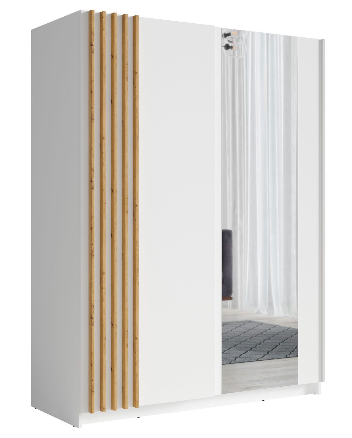 Die Lamellen in moderner Holzoptik verleihen diesem Schrank einen zeitlos eleganten Look und dienen zugleich als Griffleiste zum öffnen der linken Tür.