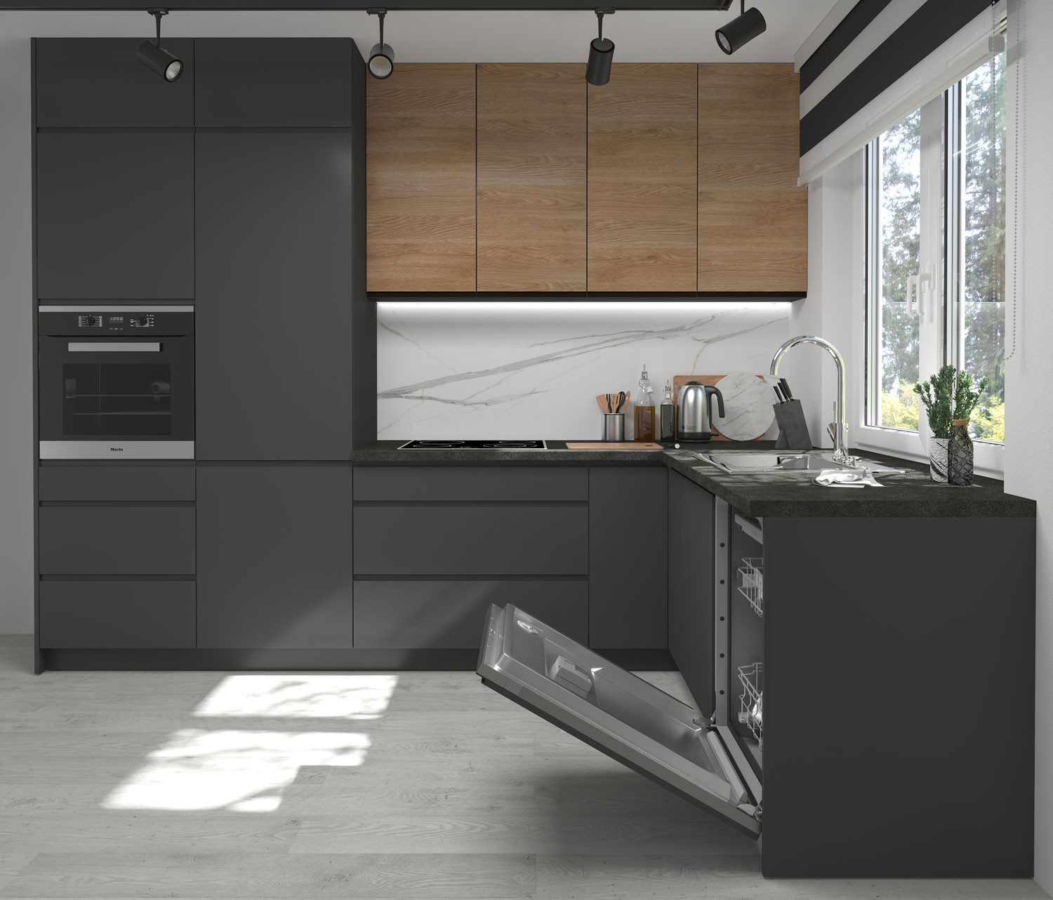 - Fronten der Hängeschränke: modernes Holzdekor mit schwarzen Griffmulden und Abschlusskanten