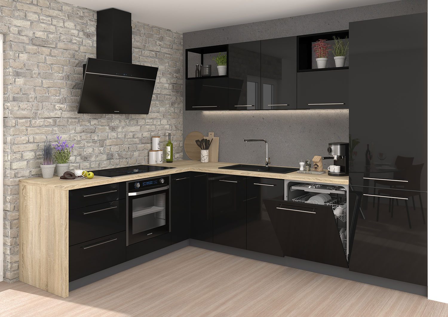 Set beinhaltet | 3x Hängeschrank, 2x Wandregal, Schubladenunterschrank, Herdumbauschrank, Eckunterschrank, Spülenunterschrank, Geschirrspülerfront, Kühlumbauschrank |