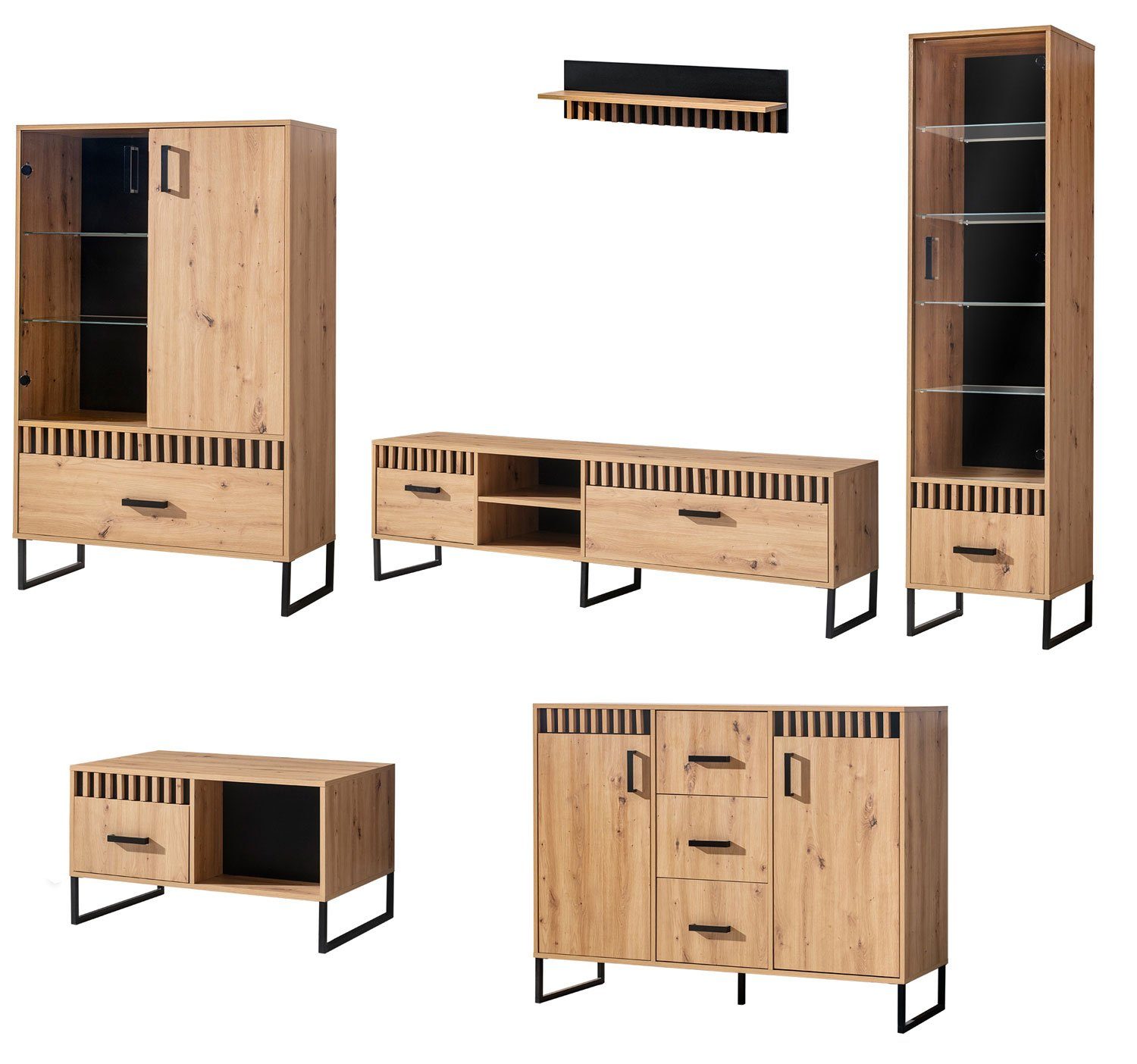 Lieferumfang | 1x Vitrine ohne Dekoration, 1x Highboard ohne Dekoration, 1x Lowboard ohne Dekoration, 1x Wandregal ohne Dekoration, 1x Couchtisch ohne Dekoration,1 Couchtisch ohne Dekoration |