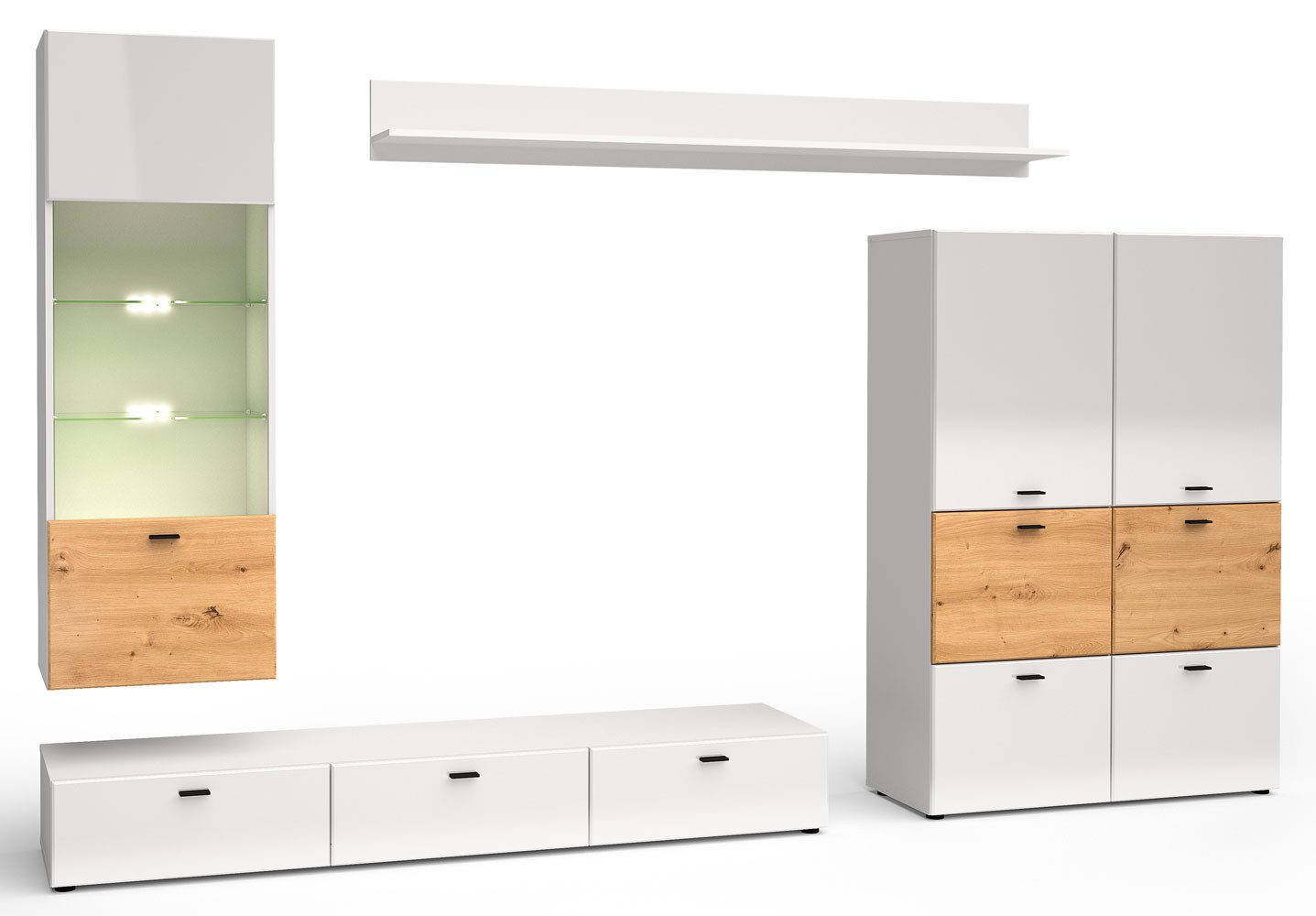 Lieferumfang | 1x Hängevitrine mit Beleuchtung, 1x Highboard,1x Lowboard, 1x Wandregal |