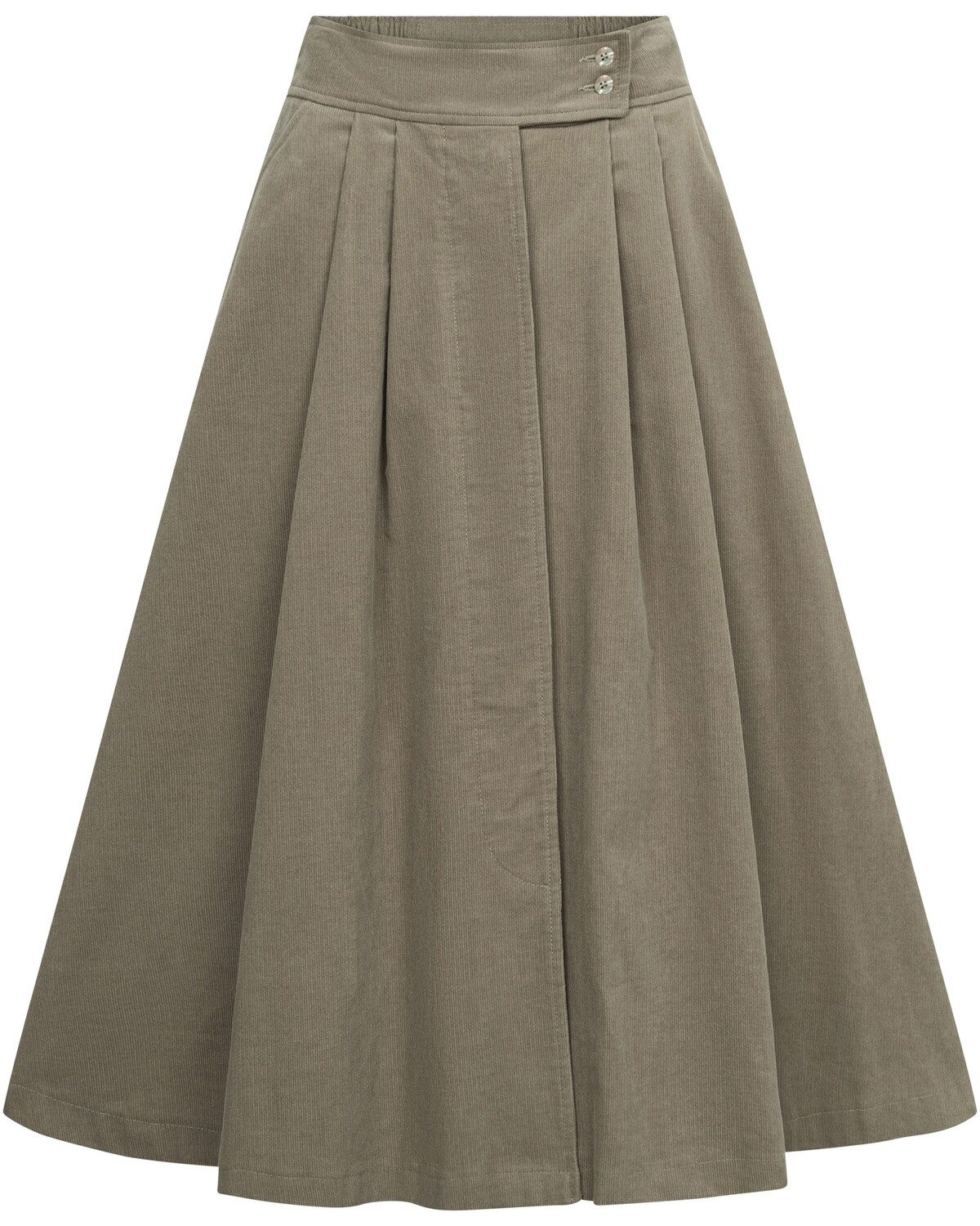 Der Rock Rada von FELICITAS verbindet ein elegantes Design mit hohem Tragekomfort. Aus feinem Baumwollcord gefertigt, besticht dieser Rock durch seine angenehme Haptik und ansprechende Optik. Die verdeckte Knopfleiste sorgt für eine klare Silhouette, während die Falten im Vorderrock dem Stück eine raffinierte Note verleihen und gleichzeitig für Bewegungsfreiheit sorgen. Praktische Eingriffstaschen an den Seiten fügen nicht nur Funktionalität hinzu, sondern setzen auch einen lässigen Akzent. Das Rückenteil ist mit einem geteilten Gummibund ausgestattet, der für zusätzlichen Komfort und eine optimale Passform sorgt. Echte Perlmuttknöpfe setzen dezente, edle Akzente und betonen die hochwertige Verarbeitung des Rocks. Vielseitig kombinierbar, eignet sich der Rock Rada sowohl für den Alltag als auch für besondere Anlässe. Ob in Kombination mit einem schicken Oberteil oder einer eleganten Bluse, dieser Rock ist eine stilvolle Bereicherung für jede Garderobe und bietet die perfekte Balance zwischen Eleganz und Bequemlichkeit. Ein unverzichtbares Teil für modebewusste Frauen, die Wert auf Qualität und ansprechendes Design legen. Oberstoff: 100% Baumwolle; Futter: 100% Baumwolle