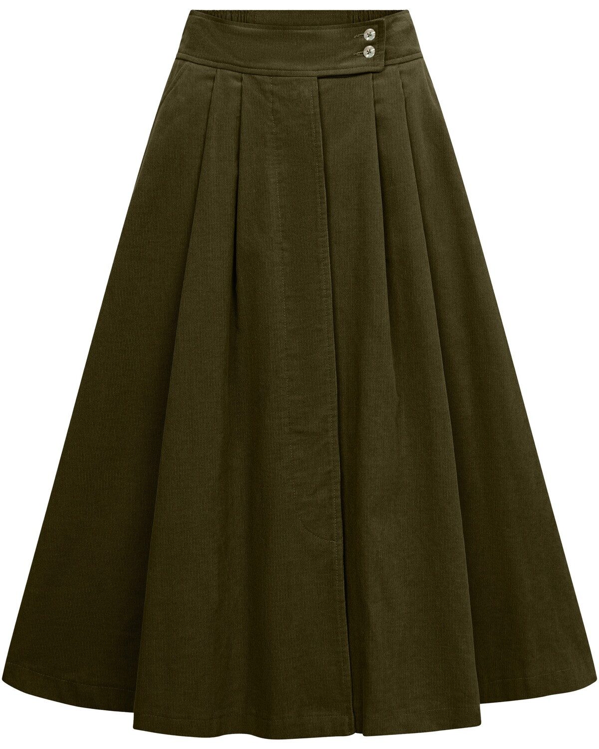 Der Rock Rada von FELICITAS vereint stilvolles Design und hohen Tragekomfort. Gefertigt aus hochwertigem Baumwollcord, bietet dieser Rock eine angenehme Haptik und eine attraktive Optik. Die verdeckte Knopfleiste sorgt für eine cleane Silhouette, während die Falten im Vorderrock dem Design eine elegante Note verleihen und gleichzeitig für eine schöne Bewegungsfreiheit sorgen. Praktische Eingriffstaschen an den Seiten bieten nicht nur Funktionalität, sondern auch einen lässigen Akzent. Das Rückenteil ist mit einem geteilten Gummibund ausgestattet, der zusätzlichen Komfort und eine optimale Passform gewährleistet. Die Verwendung echter Perlmuttknöpfe setzt dezente, aber edle Highlights und unterstreicht die hochwertige Verarbeitung des Rocks. Der Rock Rada lässt sich vielseitig kombinieren und eignet sich sowohl für den Alltag als auch für besondere Anlässe. Ob mit einem schicken Oberteil oder einer Bluse, dieser Rock ist eine stilvolle Ergänzung für jede Garderobe und bietet die perfekte Balance zwischen Eleganz und Bequemlichkeit. Ein Must-have für modebewusste Frauen, die Wert auf Qualität und Design legen. Oberstoff: 100% Baumwolle