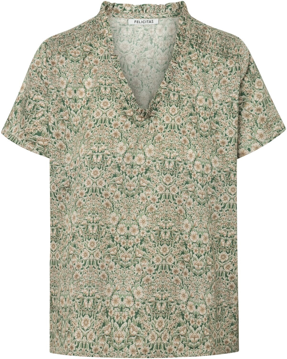 Die Kurzarm-Bluse Bernadette von Felicitas ist ein feminines und luftiges Kleidungsstück, das aus reiner Baumwolle gefertigt ist und somit für ein angenehmes Tragegefühl sorgt. Das verspielte Design zeichnet sich durch einen floralen Allover-Print aus, der der Bluse eine charmante Ausstrahlung verleiht. Der V-Ausschnitt ist mit feinen Rüschen versehen, die dem Stück eine zusätzliche feminine Note geben. Die lockere Passform ermöglicht Bewegungsfreiheit und Komfort, während die Schlupfform das An- und Ausziehen erleichtert. Die Sattelnaht an der Schulter sorgt für eine gute Passform und unterstreicht die hochwertige Verarbeitung der Bluse. Dank ihres zeitlosen Schnitts und Designs lässt sich die Bluse Bernadette vielseitig kombinieren – sei es zu eleganten Röcken oder legeren Jeans. Sie ist somit eine Bereicherung für jede Garderobe, die Stil und Komfort miteinander vereint. Oberstoff: 100% Baumwolle