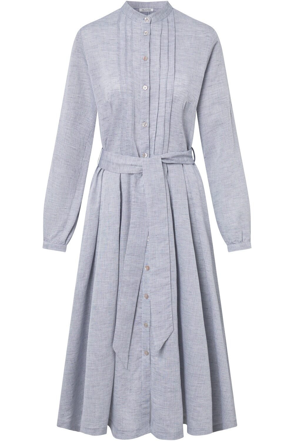 Eleganz und Komfort vereint: das Felicitas Midikleid Karine-1 Das Felicitas Midikleid Karine-1 in der klassischen Farbkombination Marine und Weiß ist ein wahres Meisterwerk der Mode, das Eleganz und Komfort auf einzigartige Weise vereint. Dieses Kleid ist die perfekte Wahl für alle, die zeitlose Schönheit und stilvolle Details schätzen. Hochwertige Materialien für höchsten Tragekomfort Gefertigt aus einer hochwertigen Mischung von 60% Baumwolle und 40% Leinen, bietet das Kleid nicht nur eine angenehme Haptik, sondern auch eine hervorragende Atmungsaktivität. Diese Materialkombination sorgt dafür, dass man sich auch an wärmeren Tagen rundum wohlfühlt. Der natürliche Glanz der Perlmuttknöpfe verleiht dem Kleid einen Hauch von Luxus und Raffinesse. Stilvolle Details für einen eleganten Auftritt Das Kleid ''Karine'' besticht durch seinen zarten Stehkragen und die feine Knopfleiste, die das Vorderteil ziert. Die Biesen im oberen Bereich des Kleides setzen dezente Akzente und unterstreichen die elegante Optik. Der Rockteil ist in Falten gelegt, was dem Kleid eine fließende Silhouette verleiht und für eine feminine Ausstrahlung sorgt. Praktische Elemente für den Alltag Neben seiner stilvollen Erscheinung überzeugt das Kleid auch durch praktische Details. Eine geschickt integrierte Nahttasche bietet Platz für kleine Alltagsgegenstände und macht das Kleid alltagstauglich. Der Bindegürtel betont die Taille auf subtile Weise und ermöglicht es, die Passform individuell anzupassen, wodurch eine lockere und dennoch elegante Silhouette entsteht. Vielseitigkeit für verschiedene Anlässe Ob für einen entspannten Stadtbummel, ein elegantes Dinner oder einen besonderen Anlass – das Felicitas Midikleid Karine-1 ist eine vielseitige Wahl, die in jeder Situation überzeugt. Seine zeitlose Eleganz macht es zu einem unverzichtbaren Bestandteil jeder Garderobe. Oberstoff: 60% Baumwolle, 40% Leinen