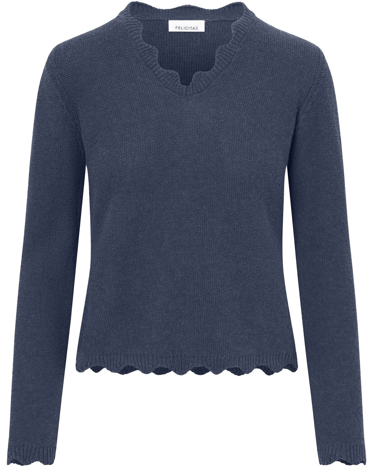 Der Damen Strickpullover Pippa von FELICITAS präsentiert sich als zeitloses Essential, das in keiner Garderobe fehlen sollte. Gefertigt aus einer hochwertigen Baumwolle-Wolle-Mischung, bietet dieser Pullover nicht nur angenehme Wärme, sondern auch ein außergewöhnlich weiches Tragegefühl. Der lässig geschnittene und leicht taillierte Stil schmeichelt der Figur und sorgt für optimalen Komfort, sodass der Pullover sowohl für den Alltag als auch für besondere Anlässe geeignet ist. Ein markantes Merkmal des Strickpullovers ist der elegante V-Ausschnitt, der zusammen mit der raffinierten Bogenkante an Halsausschnitt, Ärmelsaum und Saumkante eine feminine Note hinzufügt. Diese durchdachten Details machen den Pullover zu einem echten Blickfang und heben ihn von herkömmlichen Modellen ab. Die Kombination aus klassischem Design und modernen Akzenten verleiht dem Pippa einen einzigartigen Charakter. Die Vielseitigkeit des Strickpullovers ermöglicht zahlreiche Kombinationsmöglichkeiten. Ob lässig mit Jeans, schick mit einem Rock oder elegant mit einer Stoffhose – der Pullover Pippa passt sich mühelos verschiedenen Stilen an und sorgt für einen stilvollen Auftritt. Mit diesem Modell ist es einfach, modische Akzente zu setzen und gleichzeitig den eigenen Komfort nicht aus den Augen zu verlieren. Oberstoff: 80% Baumwolle, 20% Wolle