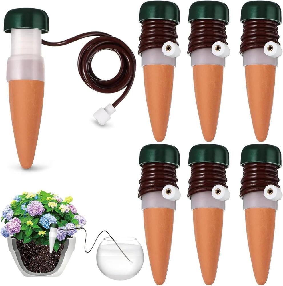 Automatisches Bewässerungssystem Geeignet für Innen- und Außenpflanzen, Topfpflanzen, Gartenpflanzen, Blumenampeln, automatische Tropfbewässerungssysteme. Sie müssen sich auf Reisen keine Sorgen um Pflanzen machen. Automatische Bewässerungssets können Pflanzen jederzeit und überall rehydrieren und sind die beste Wahl für Pflanzenhobbys.Funktionsprinzip Nach dem Siphonprinzip wird das Wasser entsprechend den Bedürfnissen der Pflanzen in den Boden gepumpt, und der Bewässerungspfahl wird direkt in den Boden gesteckt, und wenn der Boden trocknet, transportiert der Bewässerungspfahl allmählich Wasser in den umgebender Boden. Der Boden ist feucht genug, um den Fluss des Bewässerungsstapels zu stoppen und die Wassermenge automatisch an die Bodenfeuchtigkeit anzupassen.Gebrauchsanweisung Bedecken Sie den Stapel vollständig mit Wasser, um ein Vakuum im Inneren des Stapels zu erzeugen, stecken Sie dann den Gießstab in die Topfpflanze und stecken Sie das Ende des Schlauchs in den nahe gelegenen Wassertank. Wenn die Bodenfeuchtigkeit nicht ausreicht, füllt die automatische Wassertropfensonde die Pflanzen rechtzeitig mit Wasser auf, sodass Sie eine angenehme Zeit genießen können.Langlebiges Material Mit PP und Keramik, kompaktes Design, praktisch für Büro, Haus und Garten. Denken Sie nach längerem Gebrauch daran, die Keramik zu reinigen, um die Wirkung der automatischen Bewässerung nicht zu beeinträchtigen.Bitte beachten Sie, dass je höher der Wassertank, desto größer der Wasserfluss.Ausgezeichnetes Geschenk 6 Packungen Pflanzenbewässerungsstapel sind perfekt für Familie, Freunde oder alle, die Pflanzen lieben. Kann auch für Topfpflanzen in Ihrem Haus, Büro, Terrasse oder Garten verwendet werden. Ein tolles Geschenk für Pflanzenliebhaber.