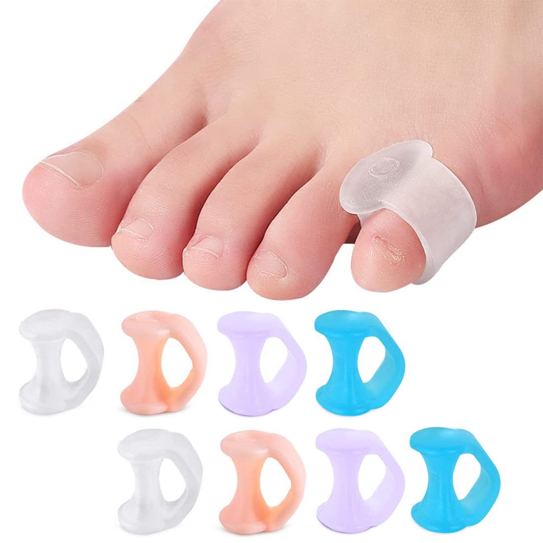 Enthält 8 Zehentrenner, jeweils 1 Paar in Weiß/Hautton/Blau/Violett. Kann am 2., 3., 4. und 5. Finger verwendet werden, hilft, überlappende Zehen zu trennen und Reibung zu reduzieren.