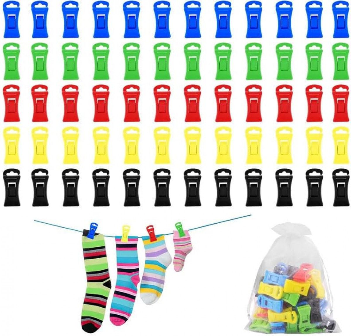Praktische Wäscheclips: 60 Stück in 5 Farben (Schwarz, Rot, Gelb, Blau, Grün) für Socken und Kleidung.