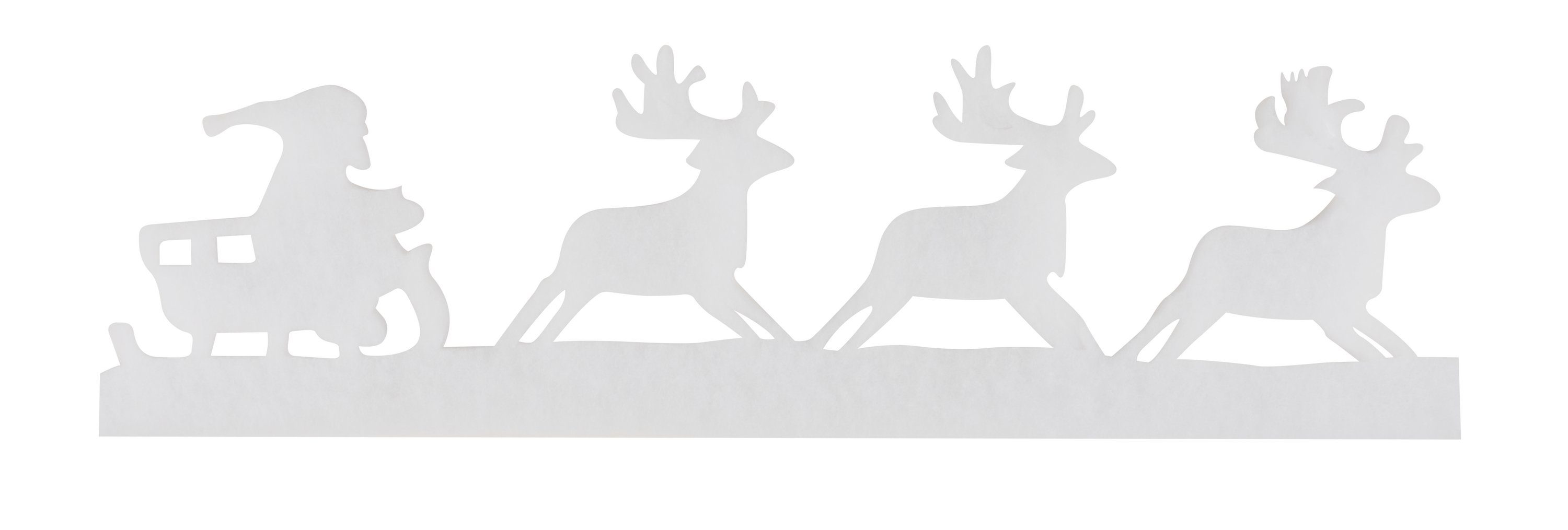 Eine nach DIN 4102 B1 schwer entflammbare, ca. 1,85m lange Rentierschlittengirlande aus Formwatte ist ca. 18 cm hoch und ca. 2 cm tief.