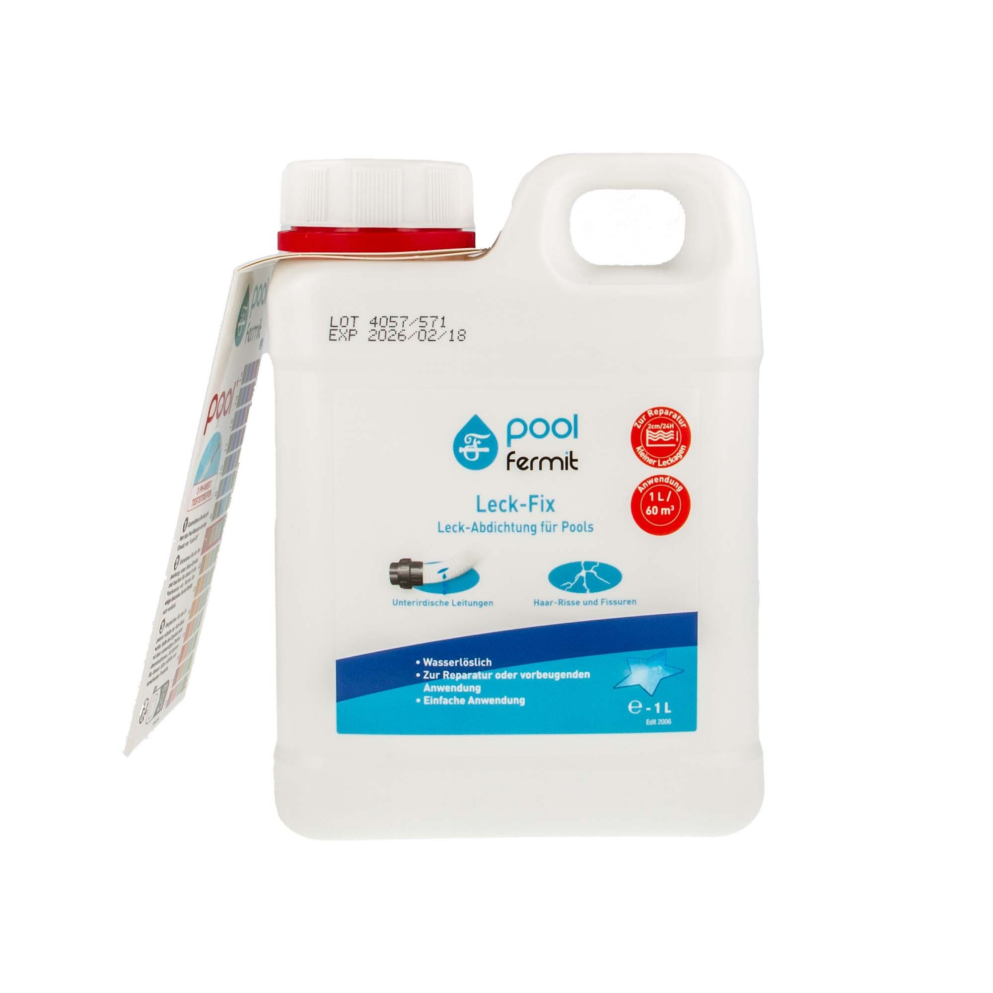 Leck-Fix verschließt kleine Undichtigkeiten in Schwimmbädern unterschiedlichster Bauart (Beton, Polyester, Acryl, Abdichtungsplane), sowie an den in der Erde verlegten Rohrleitungen.