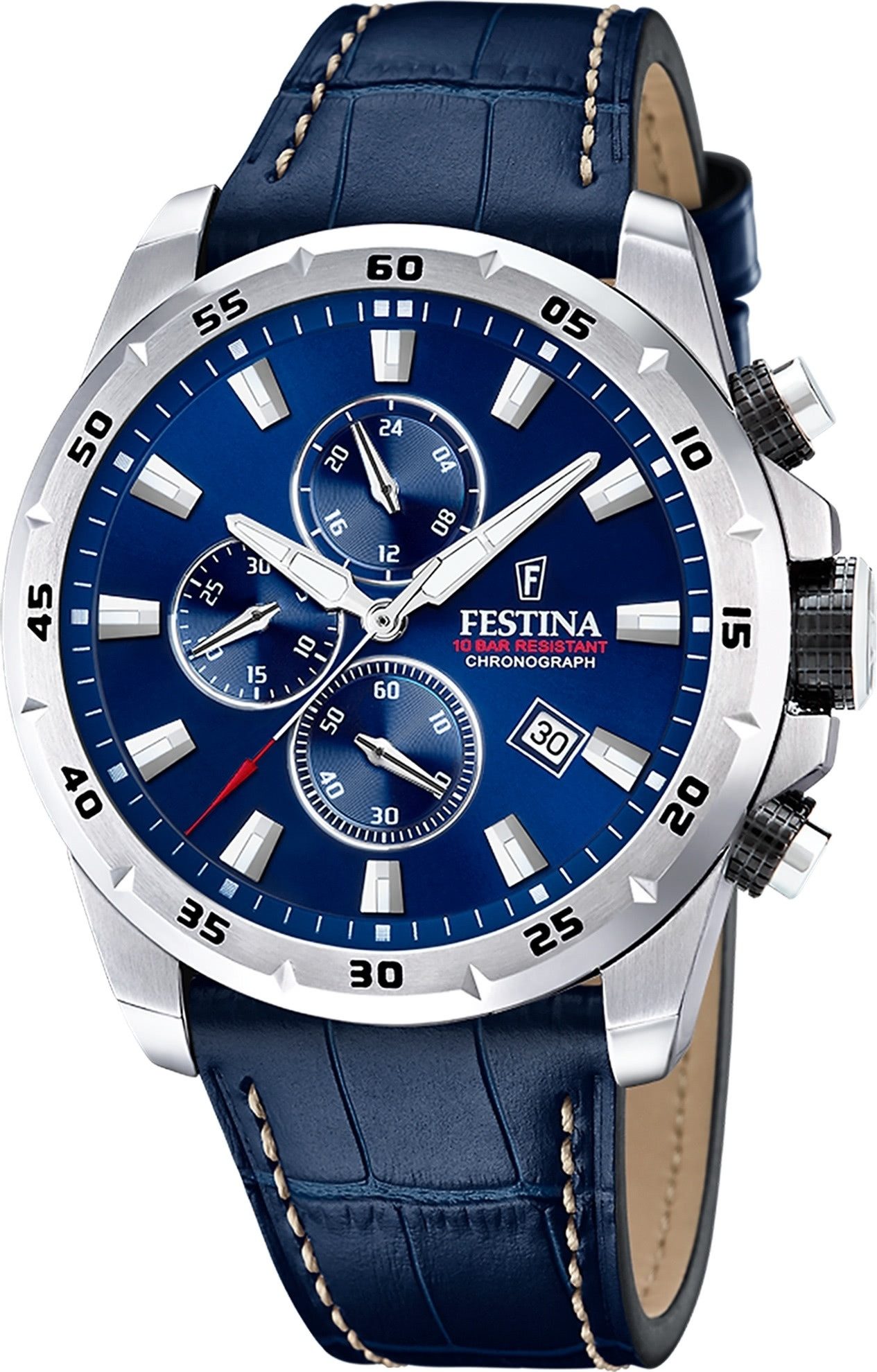 Die Elegant Uhr der Marke Festina hat ein schönes Armband aus Leder in blau mit Dornschließe. Eine Uhr aus der Festina Timeless Chronograph Kollektion für Herren in der Gehäusefarbe silber . Die Chronographuhr mit Mineralglas hat ein Zifferblatt in der Farbe blau. Die Form der Uhr ist rund und das Gehäuse ist groß ca. 45mm.