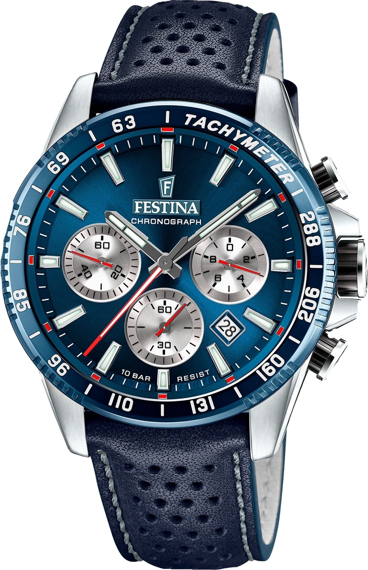 Die Elegant Uhr der Marke Festina hat ein schönes Armband aus Leder in dunkelblau mit Dornschließe. Eine Uhr aus der Festina Timeless Chronograph Kollektion für Herren in der Gehäusefarbe silber . Die Analoguhr mit Mineralglas hat ein Zifferblatt in der Farbe dunkelblau silber. Die Form der Uhr ist rund und das Gehäuse ist groß ca. 45mm.