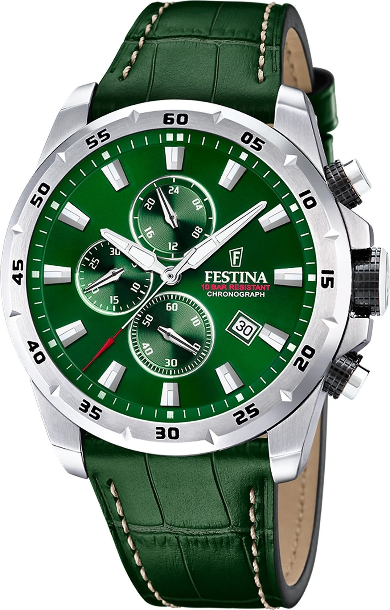 Die Elegant Uhr der Marke Festina hat ein schönes Armband aus Leder in grün mit Dornschließe. Eine Uhr aus der Festina Timeless Chronograph Kollektion für Herren in der Gehäusefarbe silber . Die Chronographuhr mit Mineralglas hat ein Zifferblatt in der Farbe grün. Die Form der Uhr ist rund und das Gehäuse ist groß ca. 45mm.