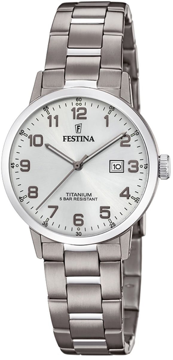Die Elegant Uhr der Marke Festina hat ein schönes Armband aus Titan in silber mit Faltschließe. Eine Uhr aus der Festina Klassik Kollektion für Damen in der Gehäusefarbe titan mit Quarzwerk. Die Analoguhr mit Mineralglas hat ein Zifferblatt in der Farbe silber. Die Form der Uhr ist rund und das Gehäuse ist mittel ca. 31mm.