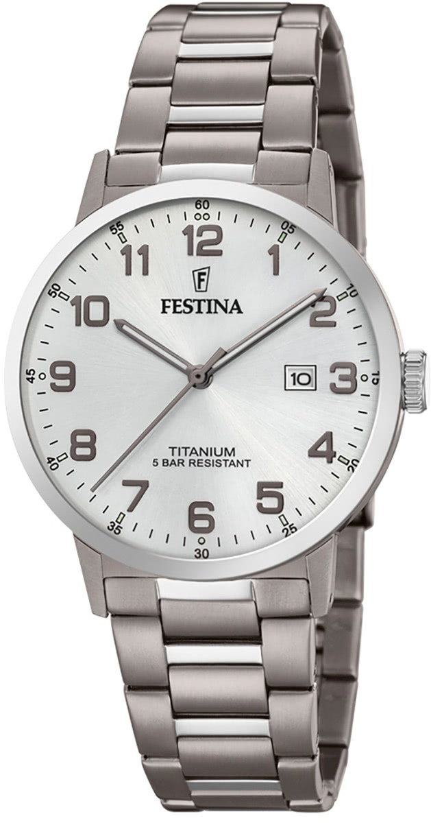 Die Elegant Uhr der Marke Festina hat ein schönes Armband aus Titan in silber mit Faltschließe. Eine Uhr aus der Festina Klassik Kollektion für Herren in der Gehäusefarbe titan mit Quarzwerk. Die Analoguhr mit Mineralglas hat ein Zifferblatt in der Farbe silber. Die Form der Uhr ist rund und das Gehäuse ist groß ca. 40mm.