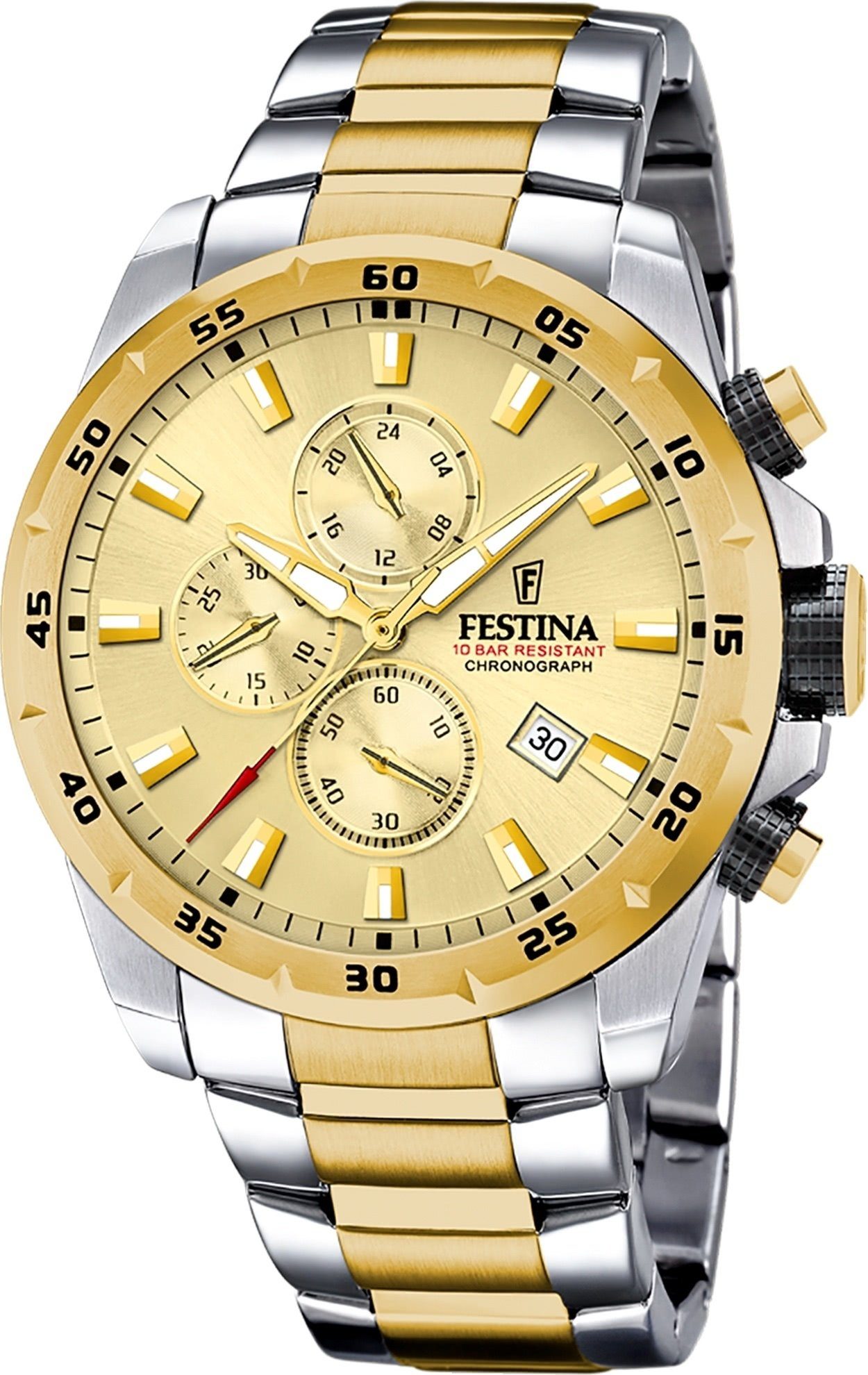 Die Sport Uhr der Marke Festina hat ein schönes Armband aus Edelstahl in silber gold mit Faltschließe. Eine Uhr aus der Festina Chronograph Sport Kollektion für Herren in der Gehäusefarbe silber . Die Analoguhr mit Mineralglas hat ein Zifferblatt in der Farbe gold. Die Form der Uhr ist rund und das Gehäuse ist groß ca. 45mm.