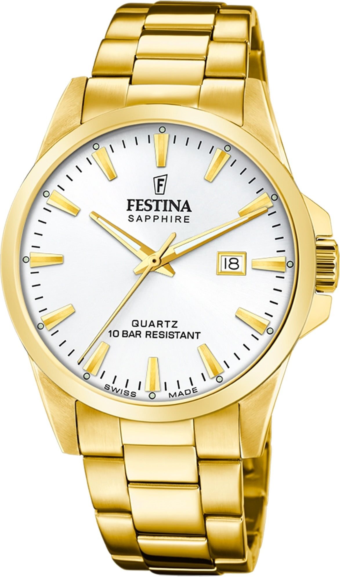 Die Elegant Uhr der Marke Festina hat ein schönes Armband aus Edelstahl in gold mit Faltschließe. Eine Uhr aus der Festina Swiss Made Kollektion für Herren in der Gehäusefarbe gold . Die Analoguhr mit Mineralglas hat ein Zifferblatt in der Farbe weiß. Die Form der Uhr ist rund und das Gehäuse ist groß ca. 41mm.