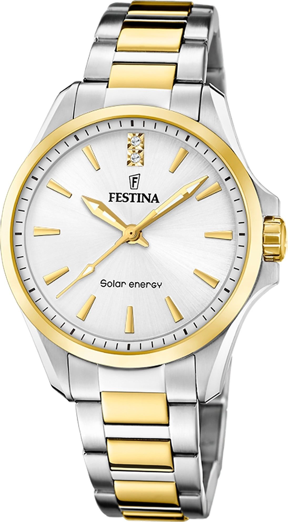 Die Luxus Uhr der Marke Festina hat ein schönes Armband aus Edelstahl in silber gold mit Faltschließe. Eine Uhr aus der Festina Solar Energy Kollektion für Damen in der Gehäusefarbe silber . Die Analoguhr mit Mineralglas hat ein Zifferblatt in der Farbe silber. Die Form der Uhr ist rund und das Gehäuse ist mittel ca. 34mm.
