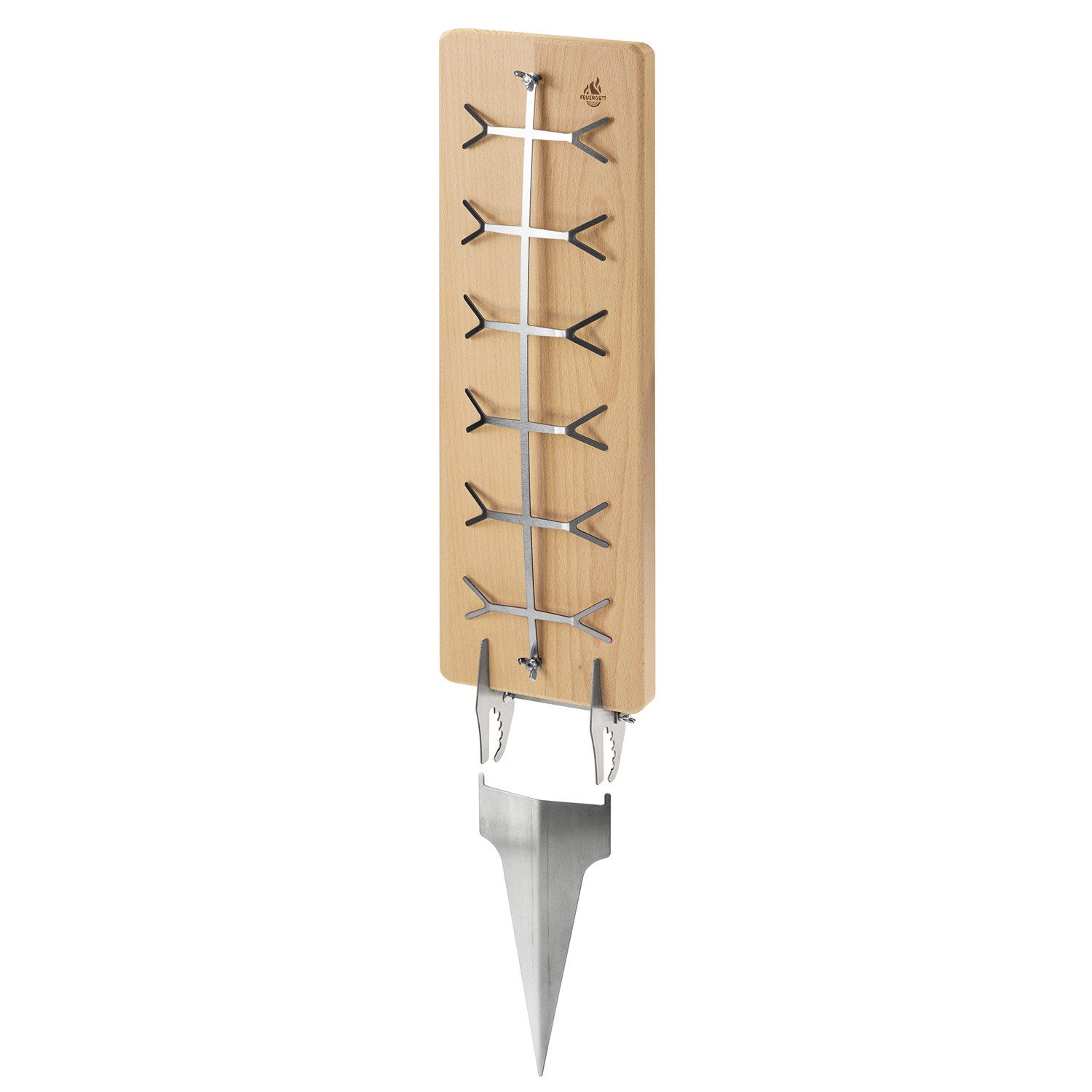 Erlebe zarten, rauchig verfeinerten Fisch direkt vom Feuer mit dem Flammlachsbrett Premium von FEUERGOTT. Bei dieser traditionellen finnischen Zubereitungsart wird der Lachs an einer Seite des Brettes fixiert, vor ein Feuer gestellt und schonend gegart. Mit der Edelstahlhalterung des Flammlachsbrettes kannst du den Fisch sicher an der Planke befestigen, ganz ohne Nägel. Das Buchenholz verleiht dem Fisch ein einzigartiges Aroma.