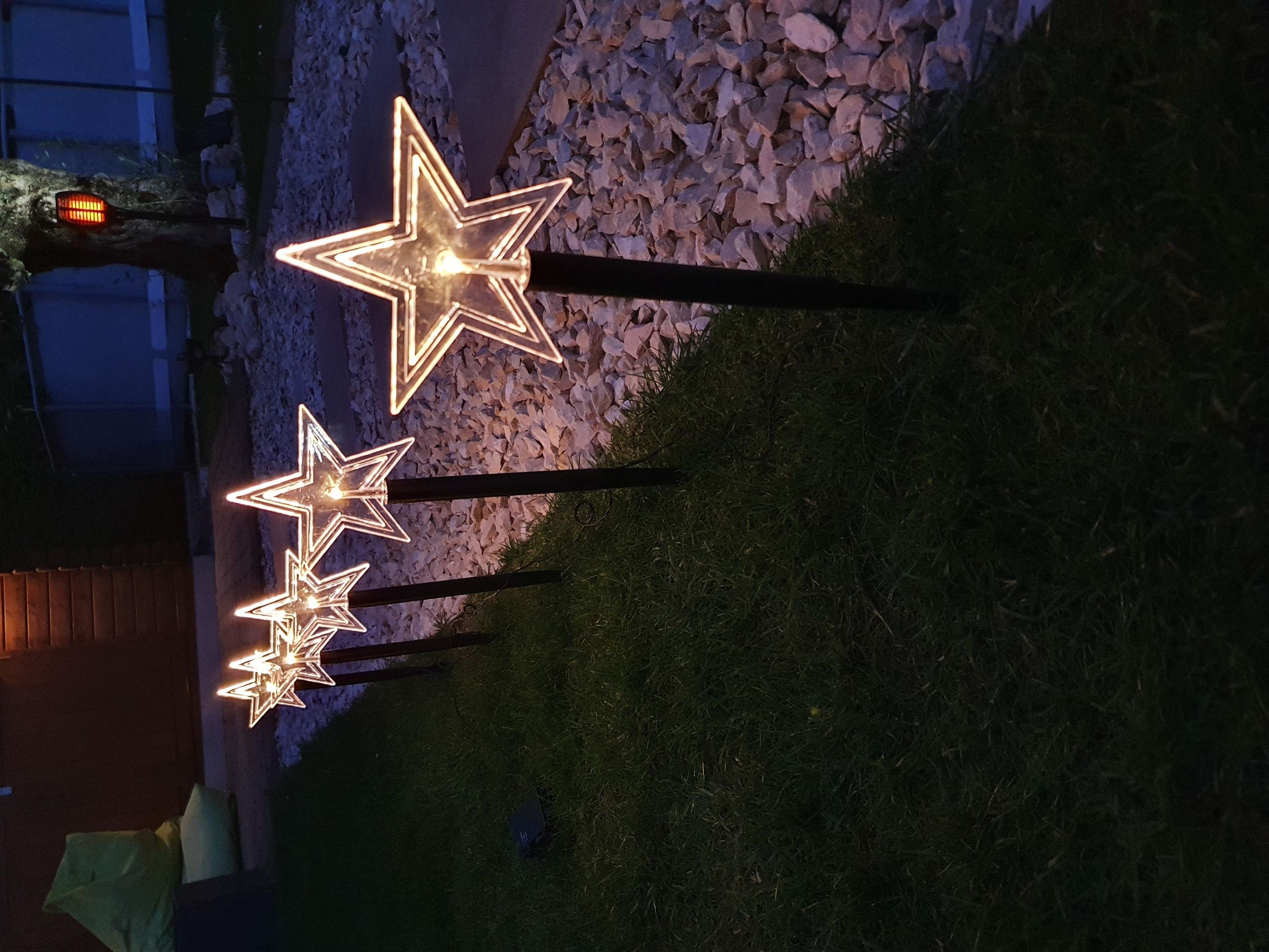 LED-Leuchtstäbe Stern, 5 Erdspieße mit je 1 Stern (11,5cm), Höhe ca. 35,5cm, warm weiss, Abstand zwischen den Stäben 35cm, Zuleitung 50 cm, IP 44 3AA Batteriebox mit Timer, Batterien nicht im Lieferumfang, für Innen und Außen