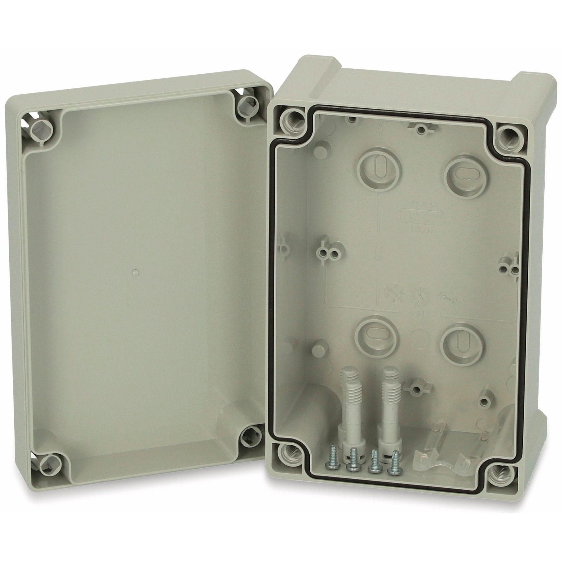 • Lieferumfang: Unterteil mit PUR Dichtung, Schrauben für Montageplatte/DIN-Schiene, Deckel mit Polyamid Deckelschrauben und Plastikscharnieren.