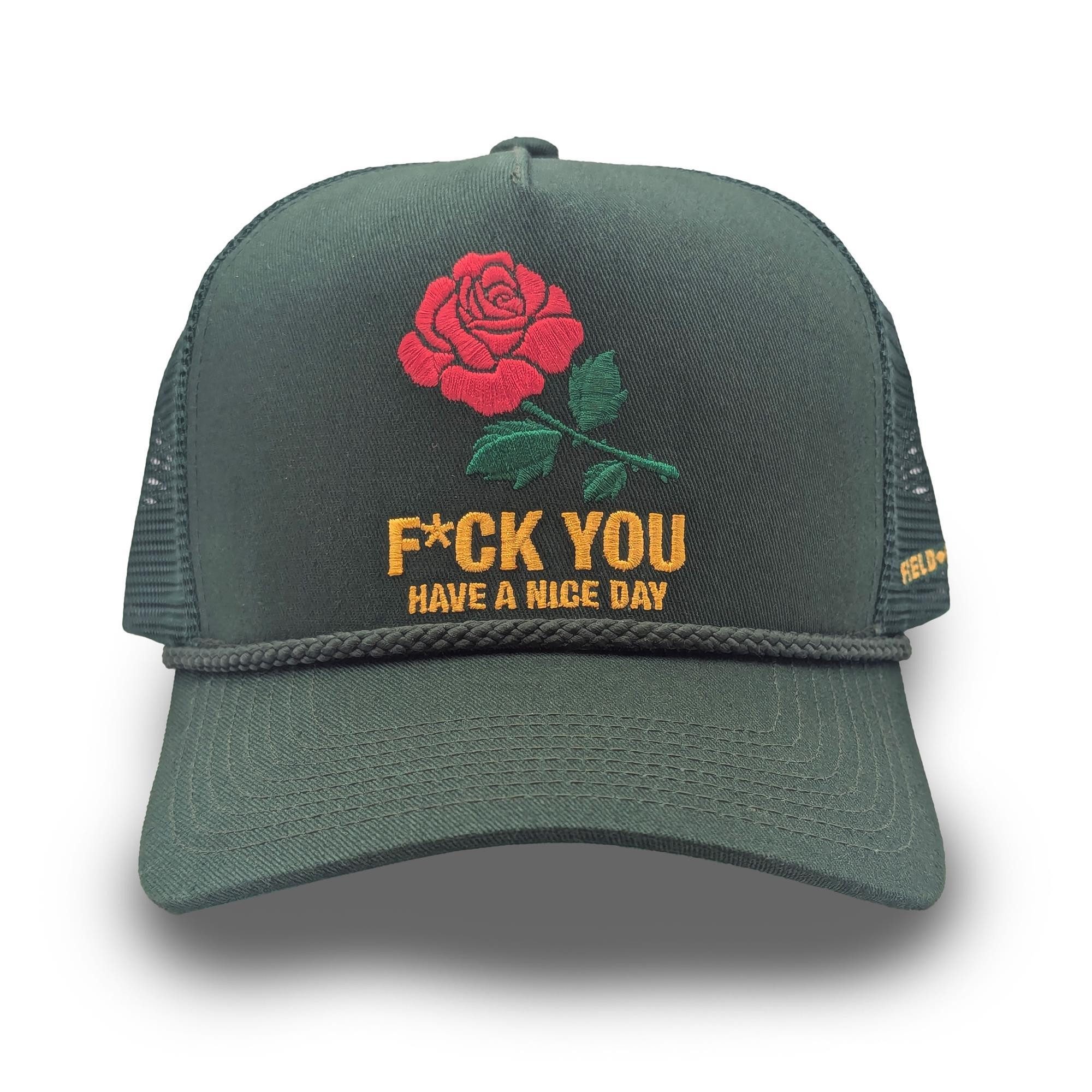 Ausstattungsdetails | Field Grade Logo Schriftzug auf der linken Meshseite, Field Grade Logo Stickerei über dem Verschluss, Grüne Schirmunterseite, Innenbänder mit Logo Schriftzug, Kordel zwischen Schild und Krone |