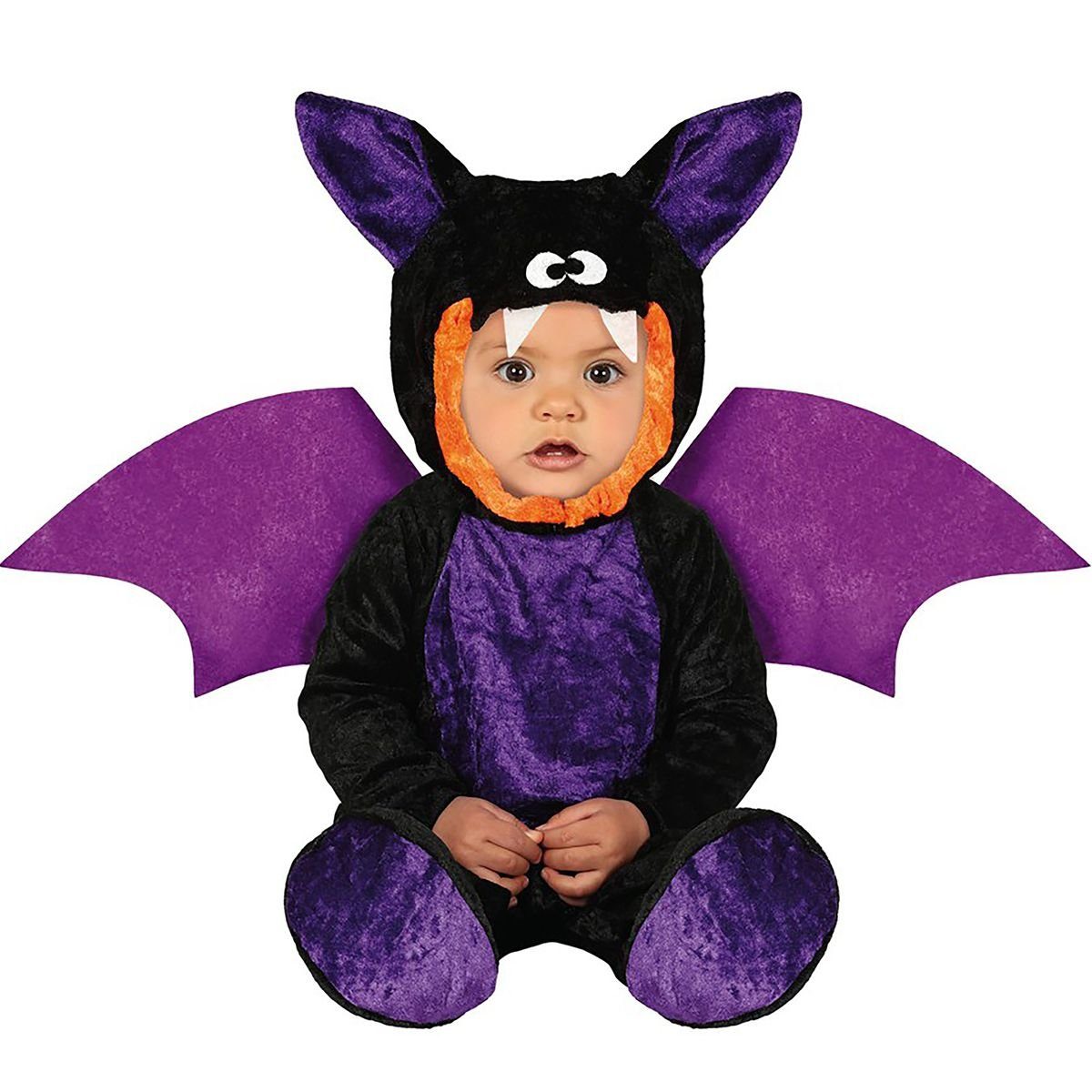 Das niedliche Baby-Kostüm Fledermaus besteht aus einem Overall in lila-schwarz mit Flügeln und Mütze. Der Overall ist hinten zu schließen, Mütze, Fußstulpen und Flügel sind separat abzunehmen.